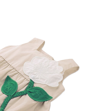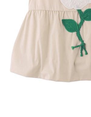 The beige bubble dress combines playful volume with elegant flower appliques for a fresh, whimsical look.