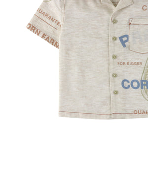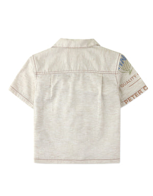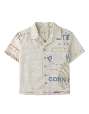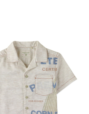 He will look adorable in this soft twill short-sleeve shirt with a playful old feed sack print!