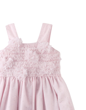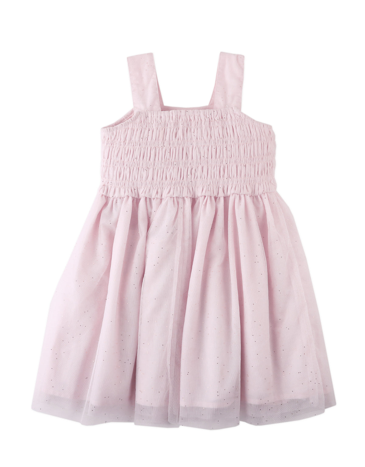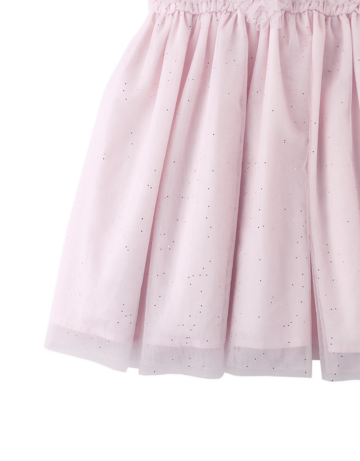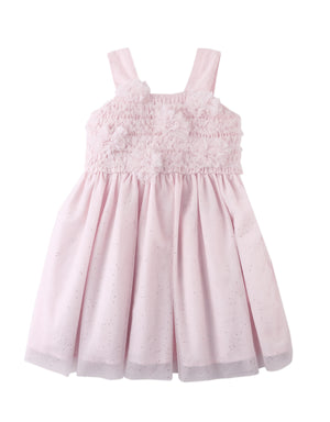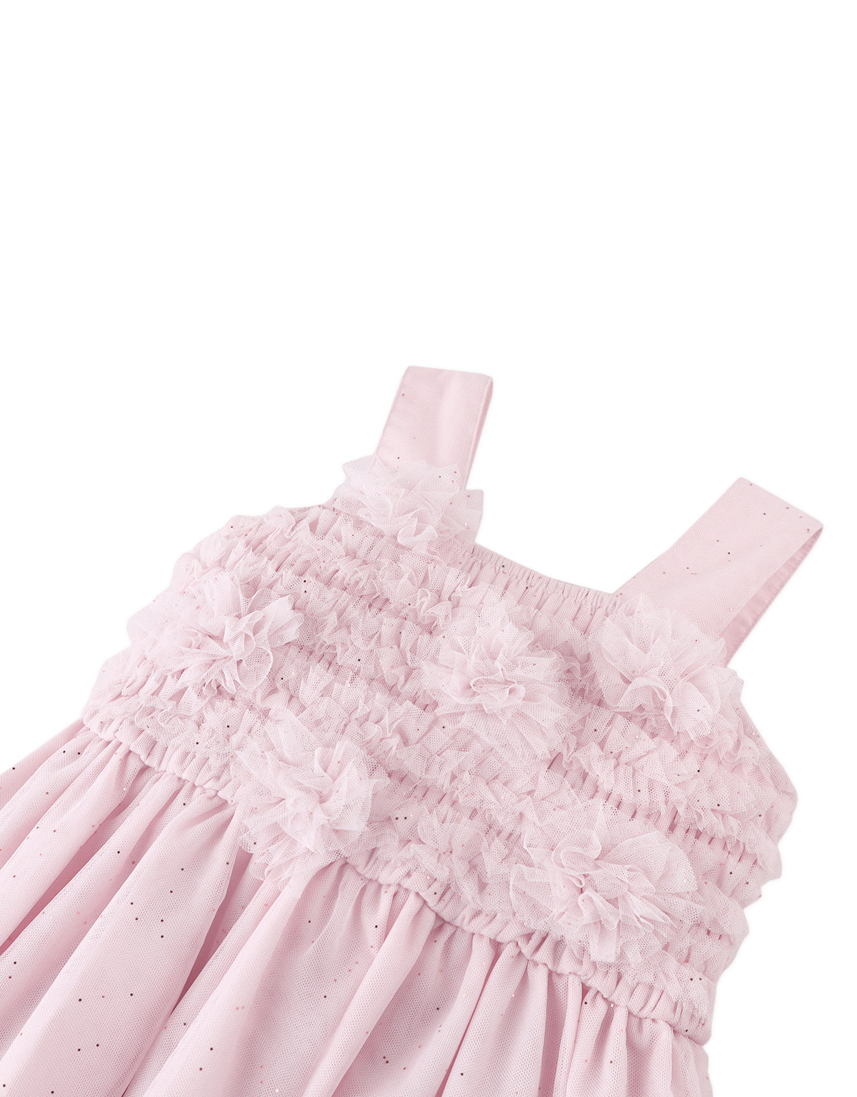 Let her twirl like a rose in bloom with this delicate light pink tulle dress, complete with ruffles that add a petal-soft charm.
