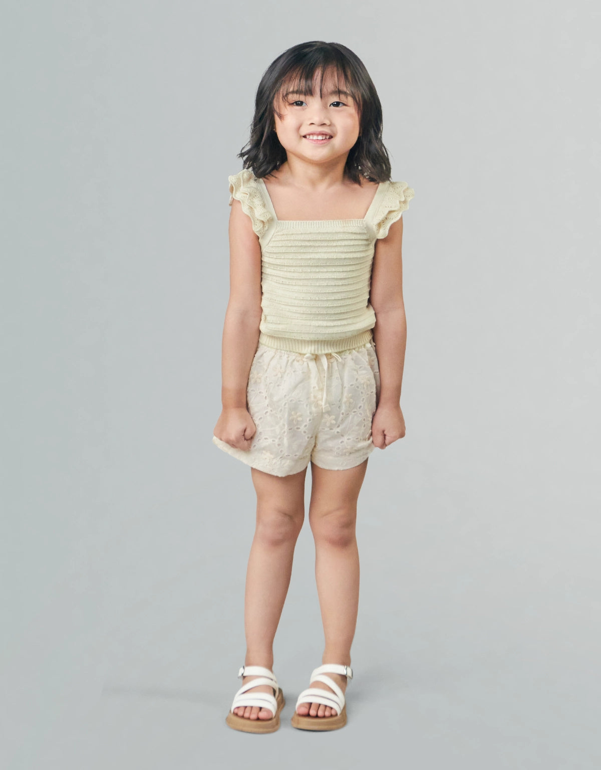 Delicate flower embroidery on sheer fabric pairs with a soft cotton lining and front ties in these shorts for a breezy, warm-weather staple your little girl can move freely in.