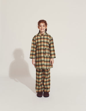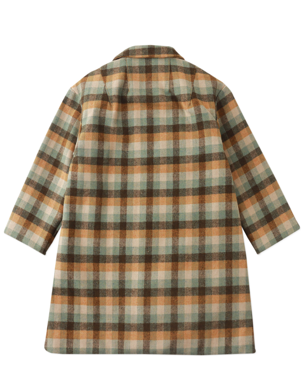 Gift your little one the Anora Long Coat in Timberline, a cozy plaid pattern with earthy tones, featuring a sweet Peter Pan collar and patch pockets for a charming and rustic addition to their wardrobe.