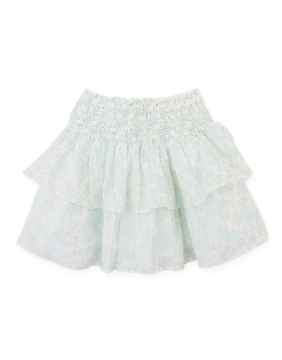 Bring a touch of storybook charm to her day with this floral toile ruffle top and smocked tiered skirt set. With dainty ruffles and gentle smocking, every step becomes a flutter of whimsy.