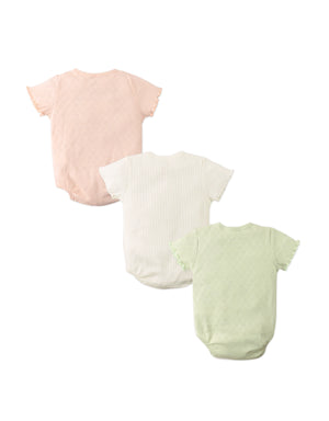 Made from soft, breathable fabric with delicate heart pointelle detailing, this 3-piece set features kimono-style short-sleeve bodysuits with side ties and snap closures for easy changes. A cheerful and gentle essential for little wardrobes.