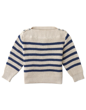 This striped cotton knit pullover with the most delightful boat neckline will keep him cute and cozy all day!