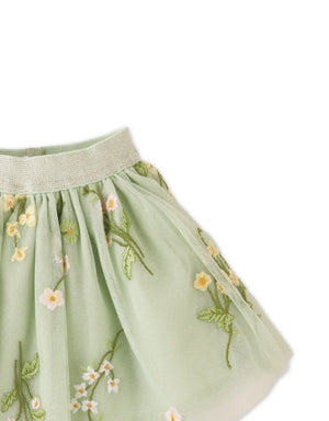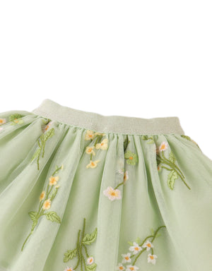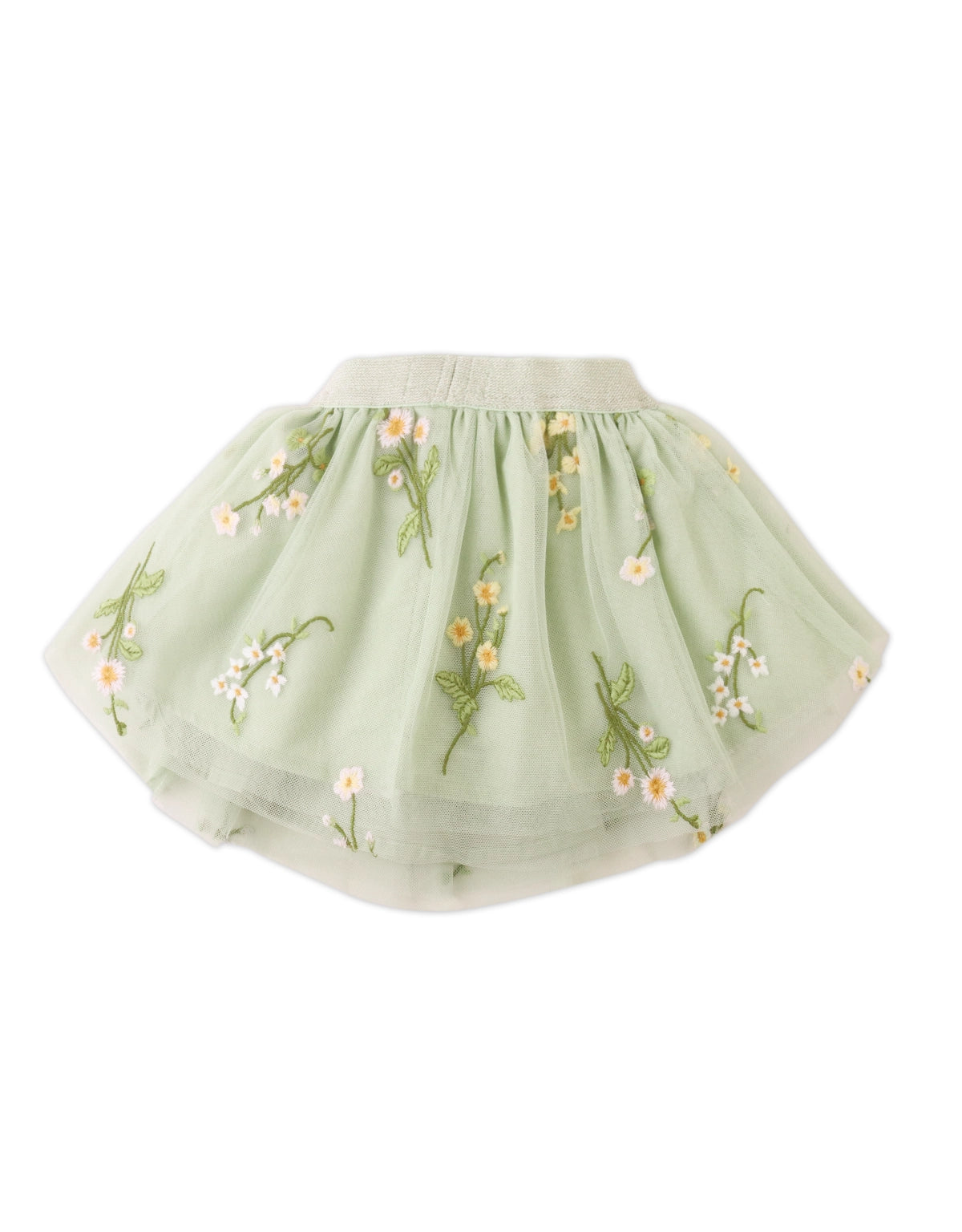 A tulle skirt adorned with floral embroidery and finished with a velvet ribbon, offering a delicate and elegant touch to your little one’s outfit. Excellent for special occasions or adding a bit of style to everyday wear.