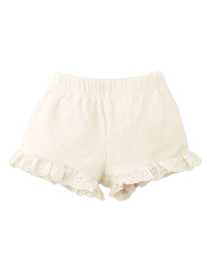 This baby girl’s two-piece set features a soft pointelle rib design with an eyelet scalloped collar, delicate ribbon slotting, and a tiny bow. Neat yet playful, it’s made for warm days and fun adventures.