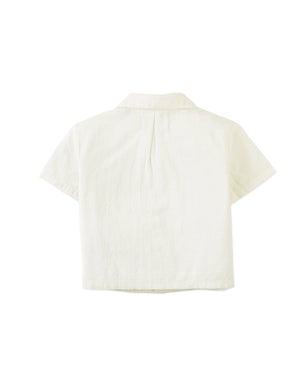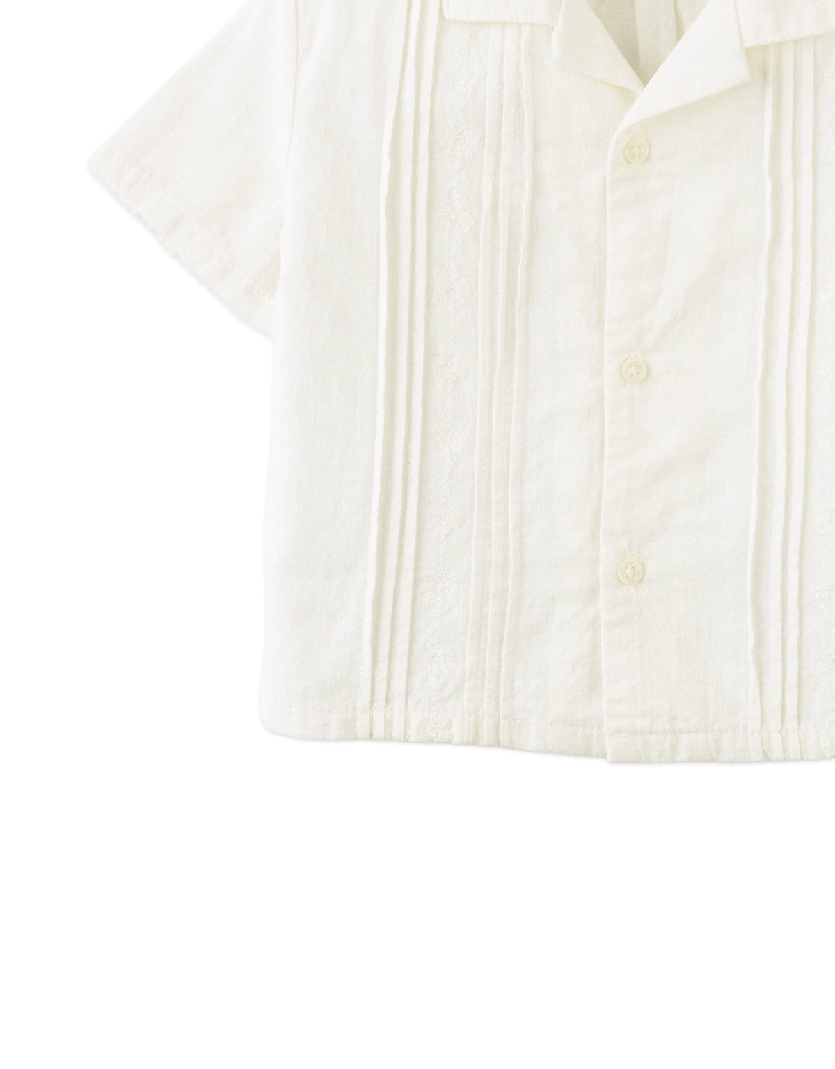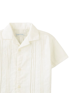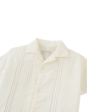 This white linen-like cotton short-sleeve guayabera shirt features classic pintucks and subtle embroidery, giving your little one a crisp, polished look perfect for warm-weather gatherings.