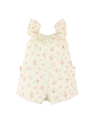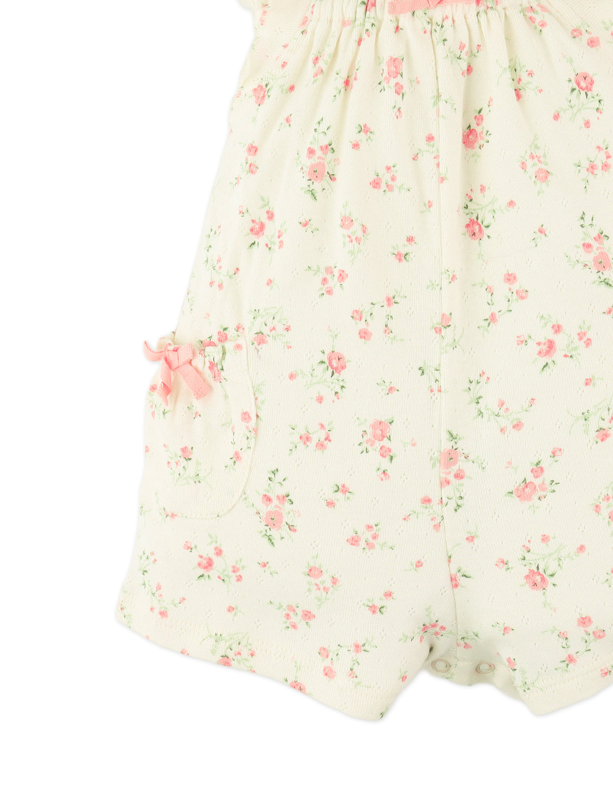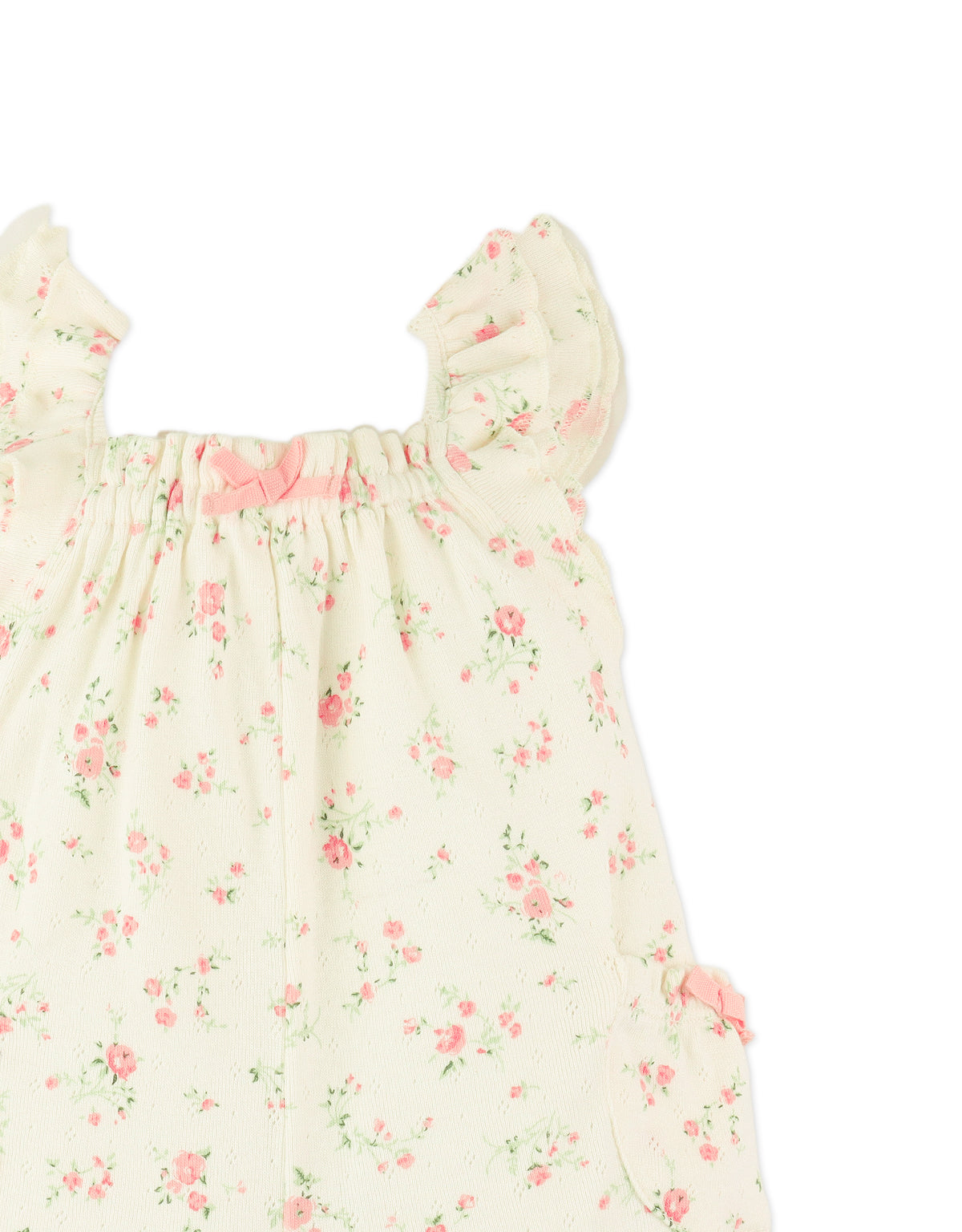 If playtime had a uniform, it would be this rose-sprinkled playsuit with ruffles for flair, pockets for treasures, and bows for that extra sprinkle of adorableness.