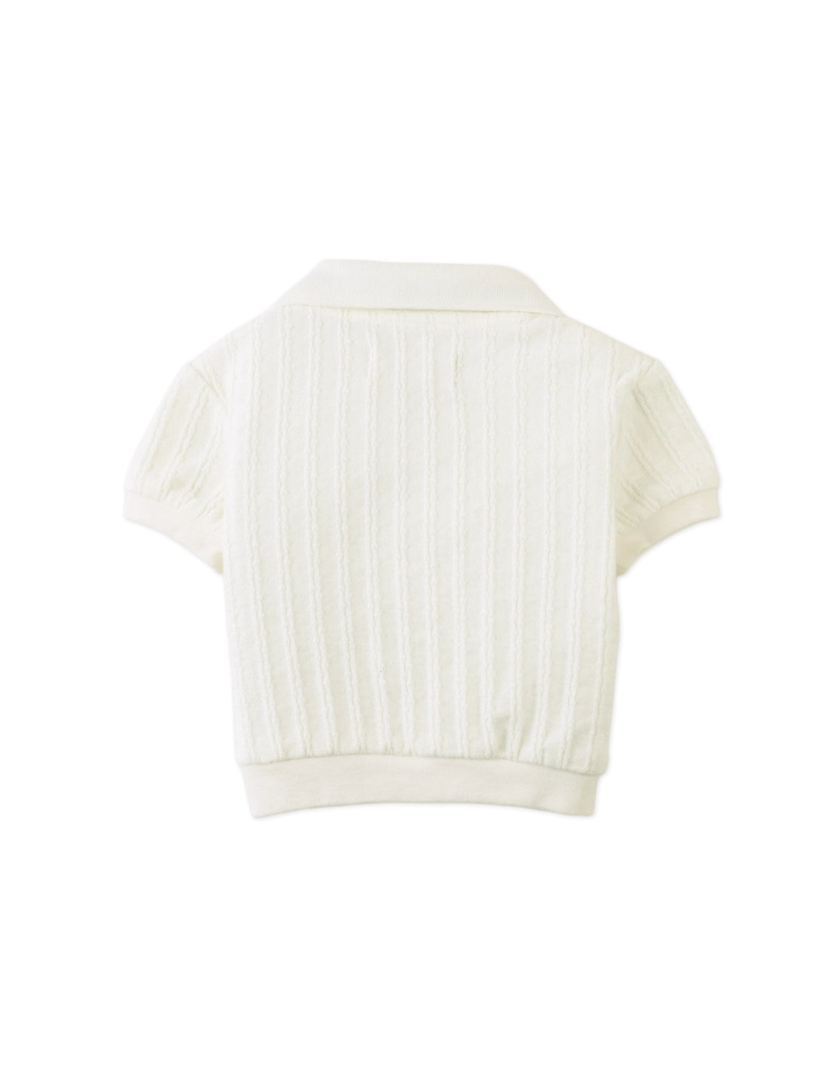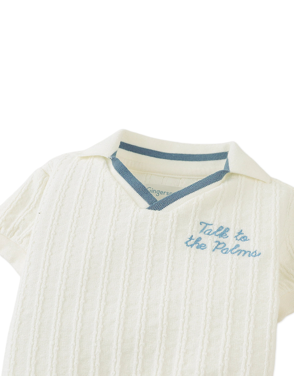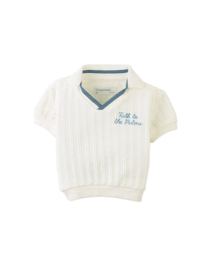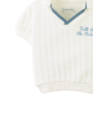 This short-sleeve knit V-neck polo shirt comes in classic white or blue and is finished with subtle embroidery for a refined touch. A versatile piece that keeps your little one cool and comfortable from day to play.