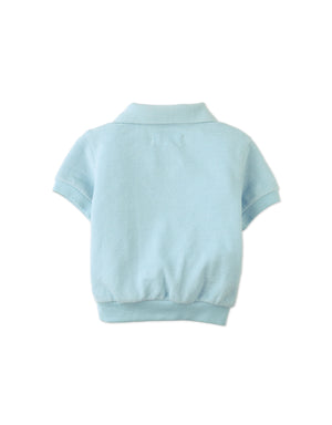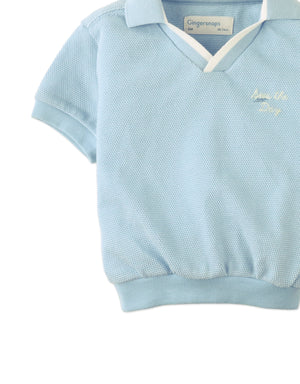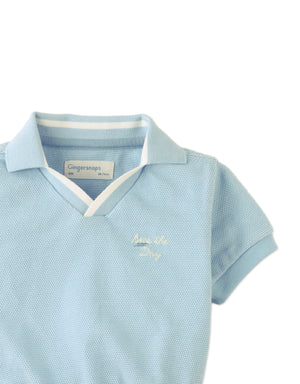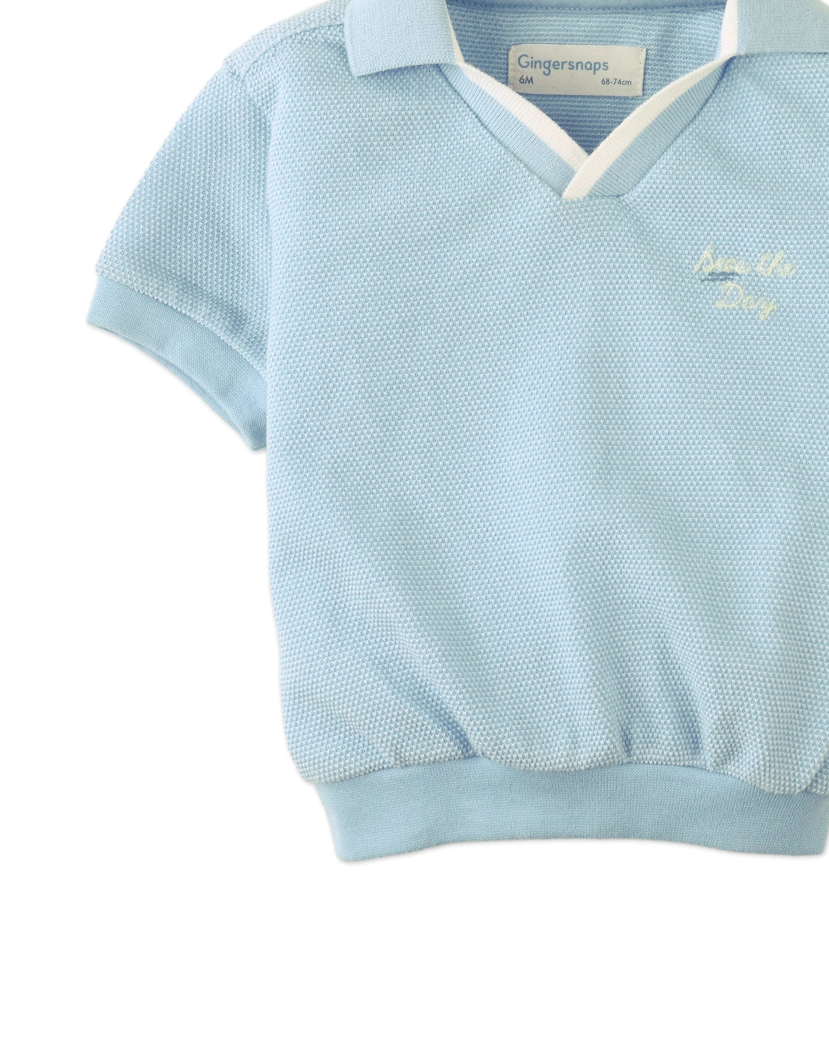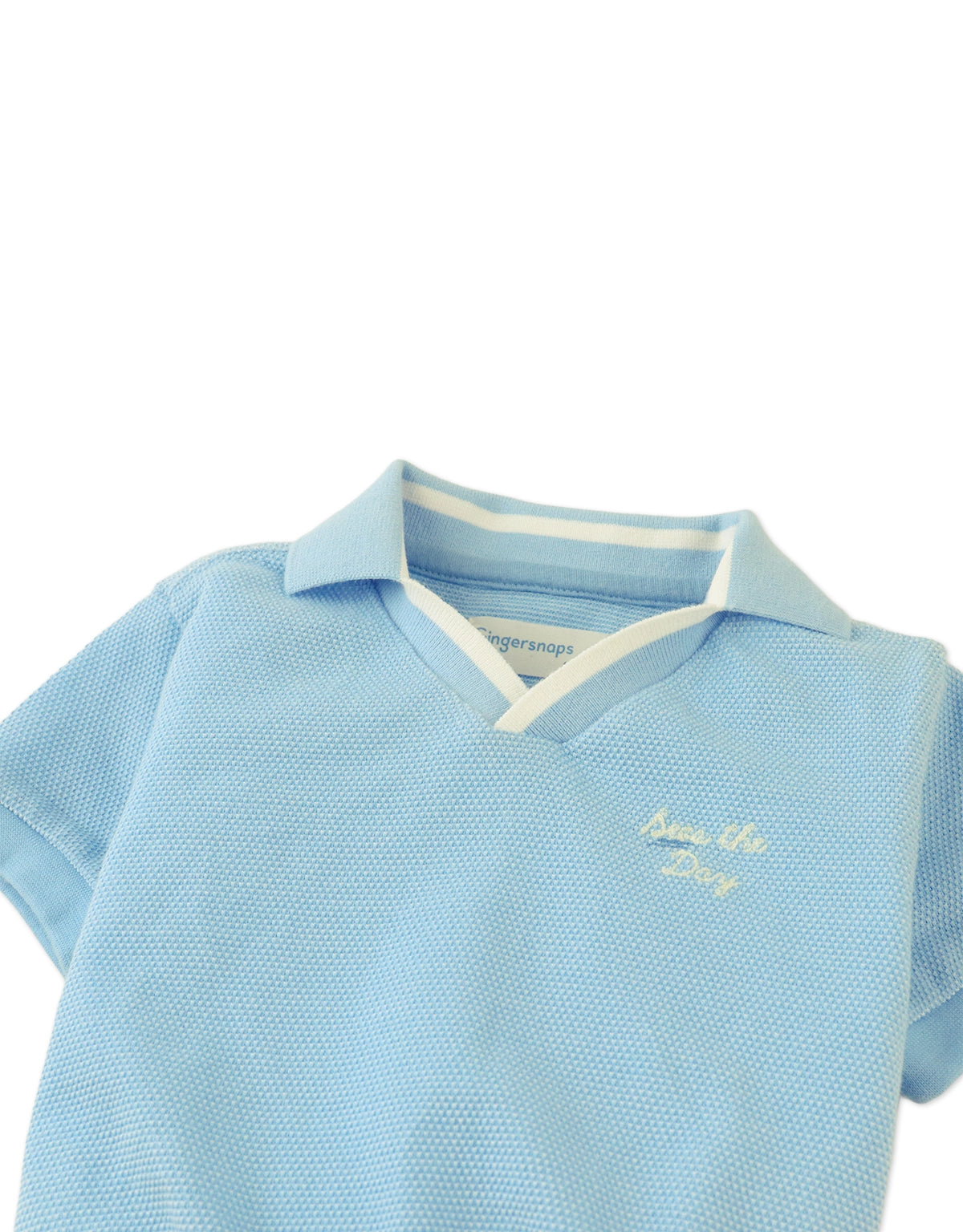 This short-sleeve knit V-neck polo shirt comes in classic white or blue and is finished with subtle embroidery for a refined touch. A versatile piece that keeps your little one cool and comfortable from day to play.