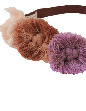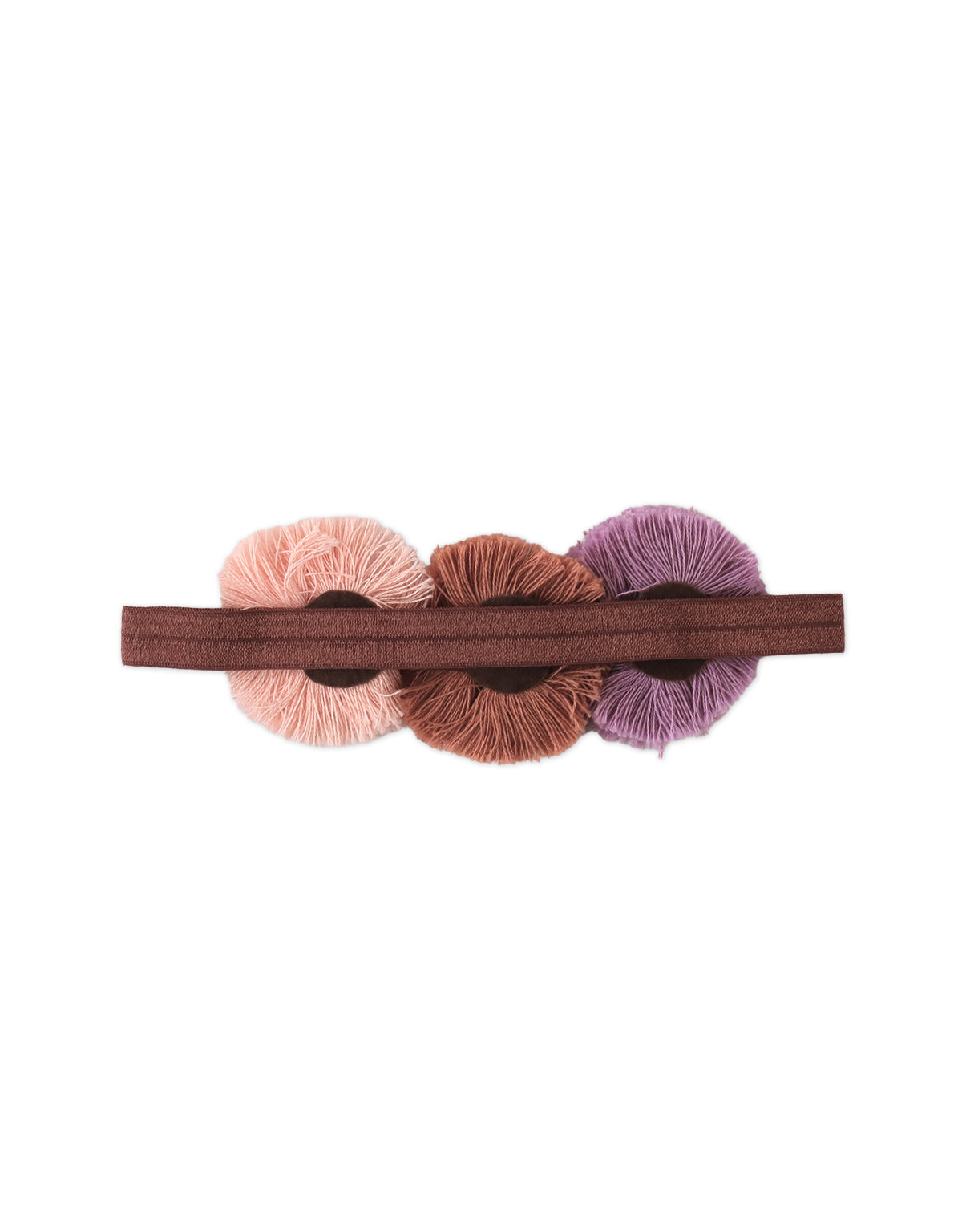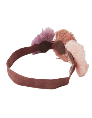 Add a playful yet stylish touch to your little one's look with this cozy yarn turban that features three flat tassels in varying colors.