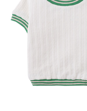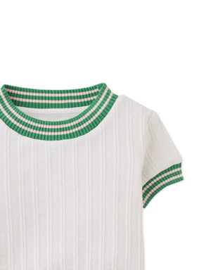 This off-white short-sleeve cable knit top, made from textured jersey, offers a cozy and classic look.