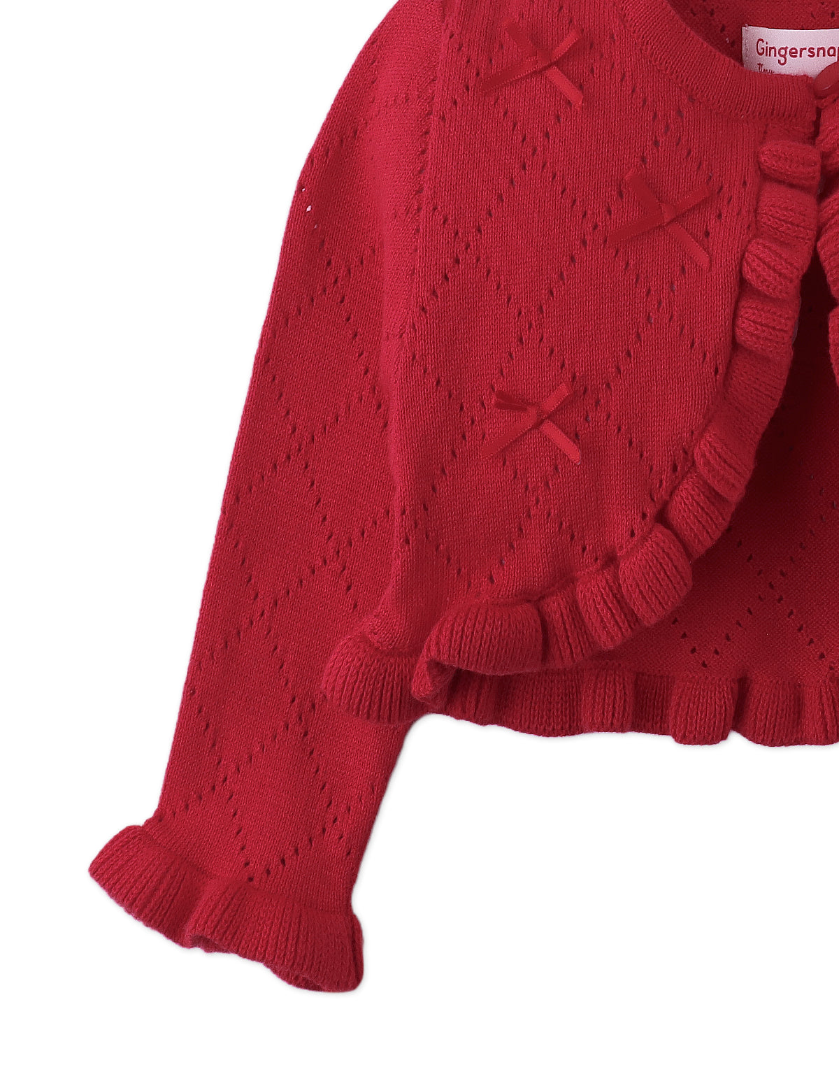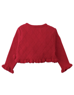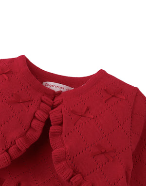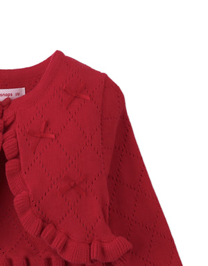 A cozy red knit sprinkled with bows, this cardigan is the perfect layering piece to wrap your little one in warmth an charm.