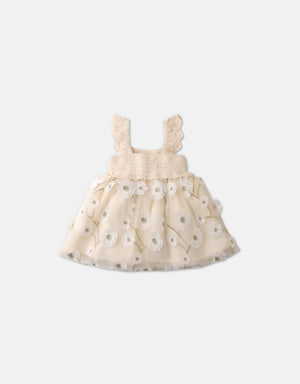 This charming set pairs a crochet-like knitted top with a 3D flower-embroidered tulle dress, creating a graceful ensemble for your little dove’s special moments.