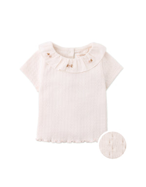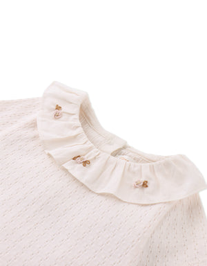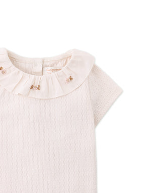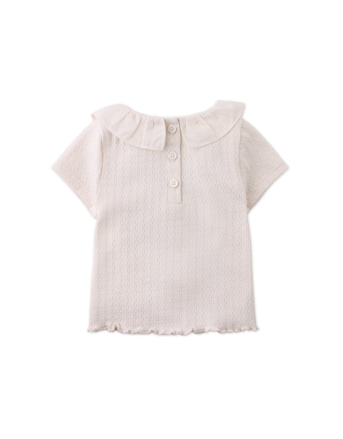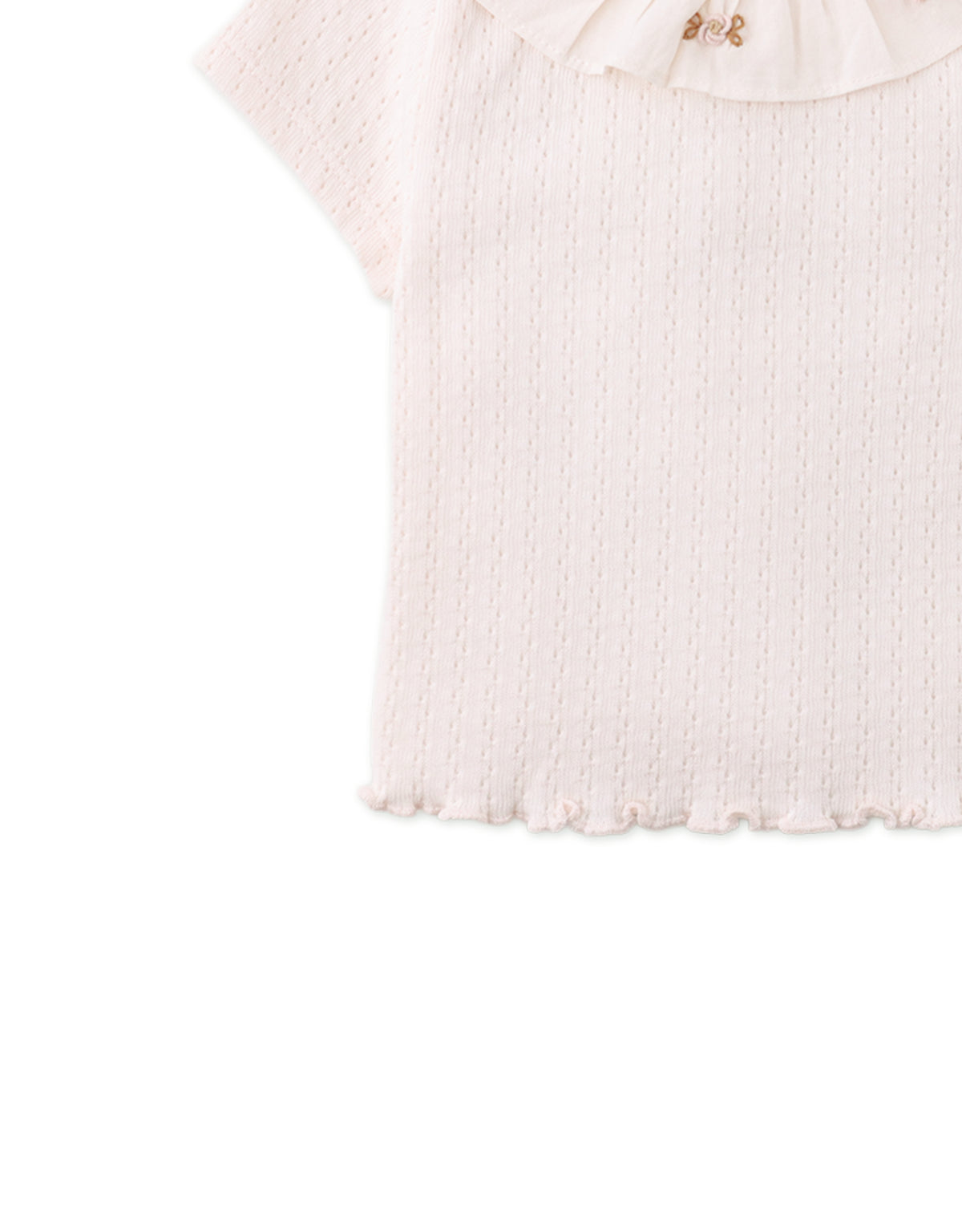 Delicate embroidery meets cheerful pointelle in this off-white ribbed top with a embroidered collar, creating a look that feels soft, airy, and perfect for your little one's daily adventures.
