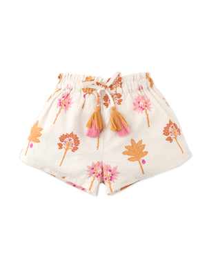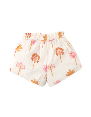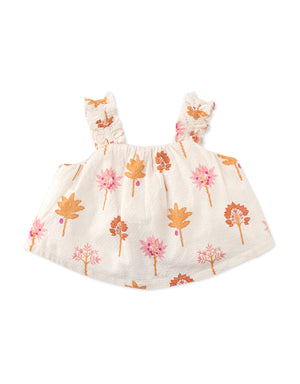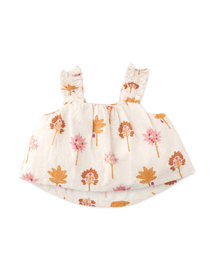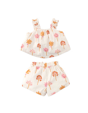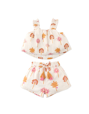 This printed cotton blouse and shorts set, featuring delicate leaf and flower patterns with braided ties, is a breezy staple for your little fairy.