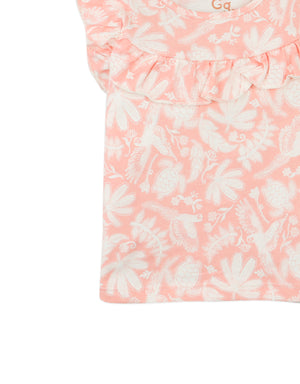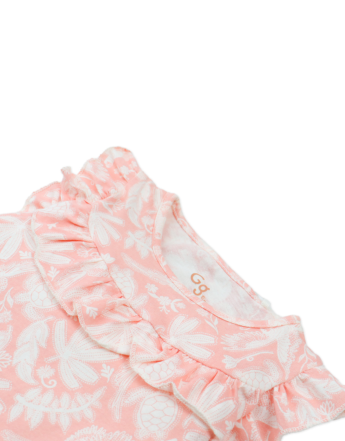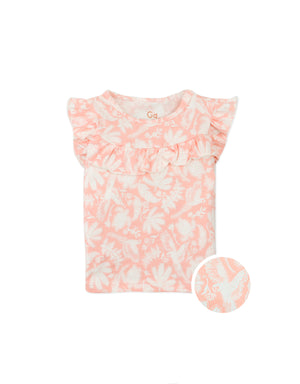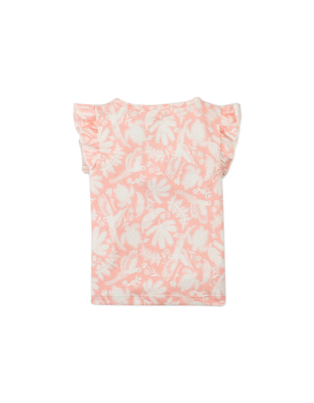Made for your little darling's picture-perfect moments, this ruffled tee comes to life in your choice of cheerful peaches or lush tropical leaves.
