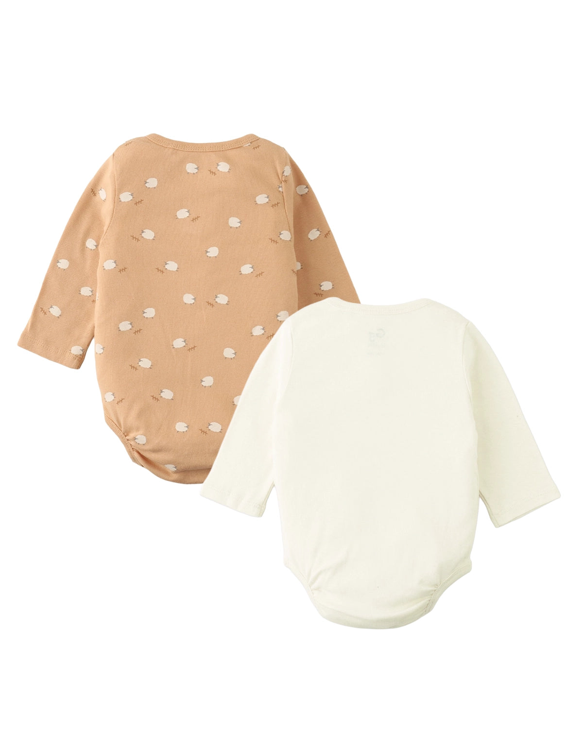 This comfortable 2-piece set includes long-sleeve Henley-style onesies adorned with either a jumping sheep print or classic white, finished with a front button placket and convenient snap closure at the crotch.