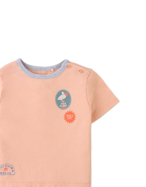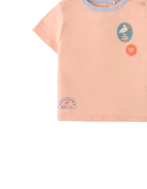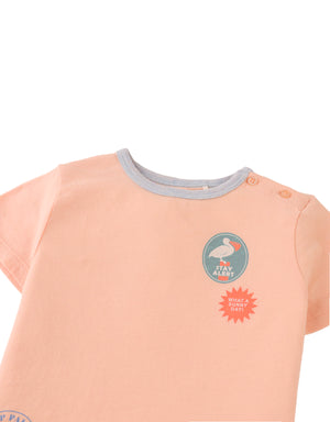 This peach short-sleeved tee, crafted from soft slub jersey, features fun prints and a practical shoulder opening for easy on-and-off. A comfy and stylish option that brings effortless flair to any casual look.