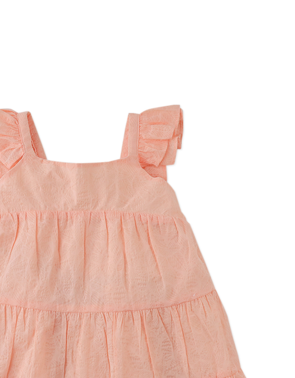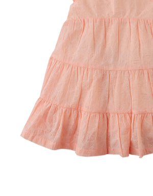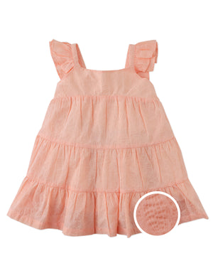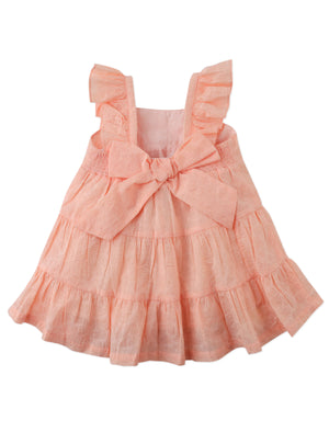 Crafted from soft cotton and finished with a delicate bow at the back our Baby Lauren peach-colored burnout woven tiered dress is a graceful favorite for your little dolly.