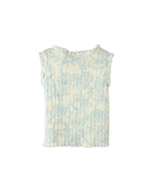 This classic ribbed tank top, available in pink and blue, is finished with delicate set-in lace, a dainty rosette, and a merrow-edged hem. It is a lovely essential with pretty details for everyday wear.