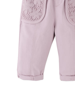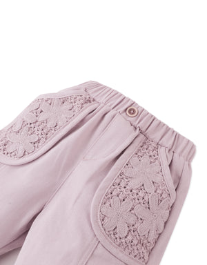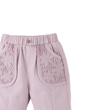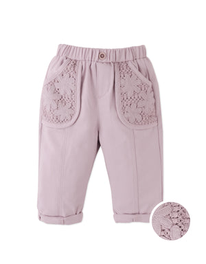 BABY MELODY SOFT TWILL PANTS WITH MESH POCKETS & CROCHET FLOWER APPLIQUES