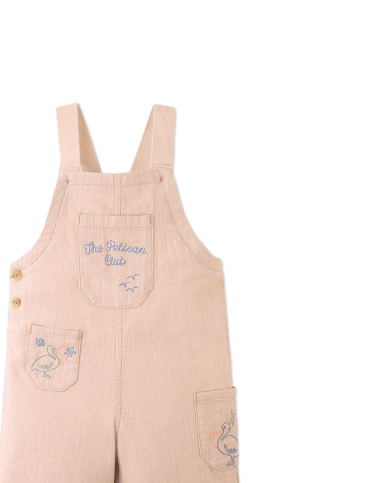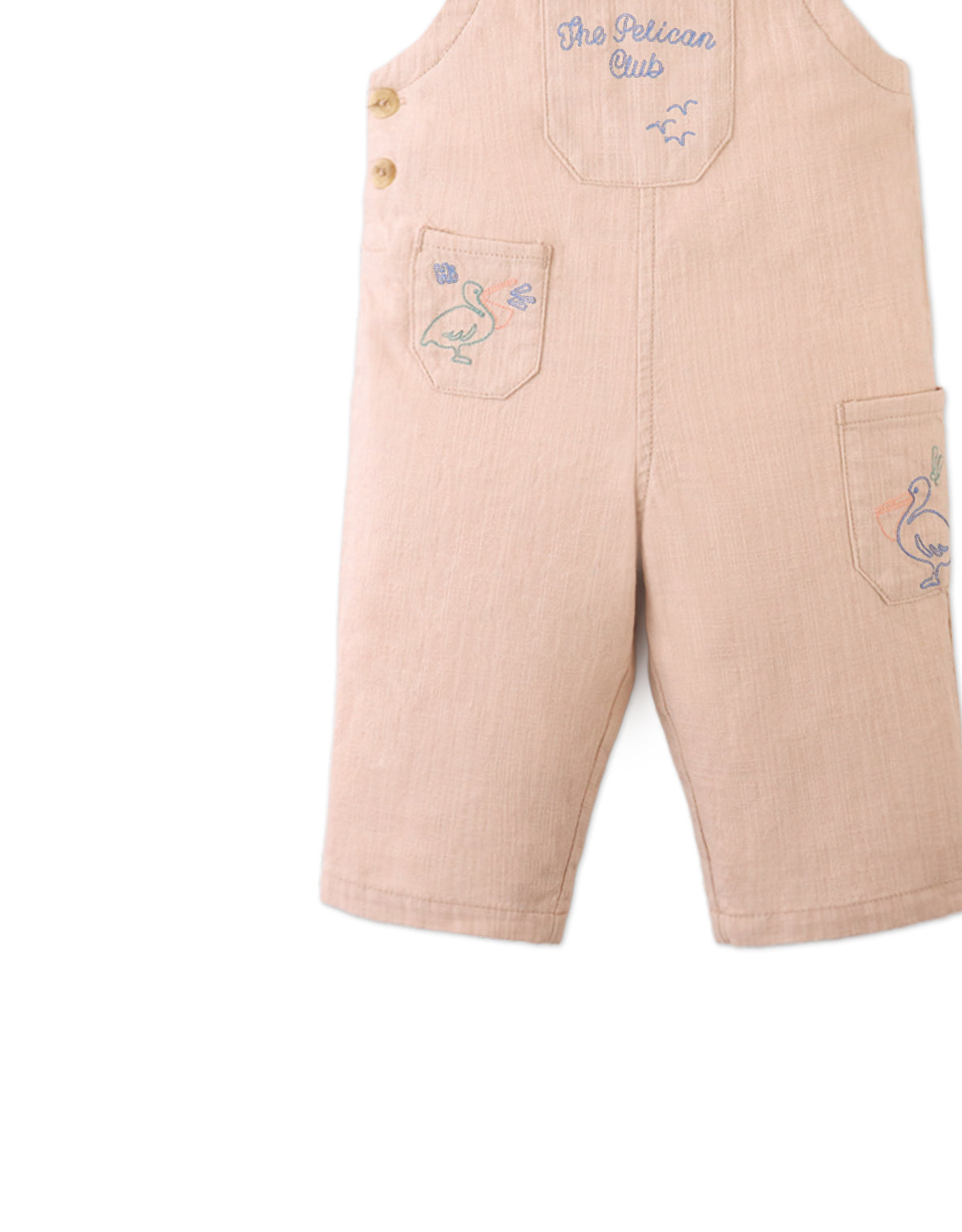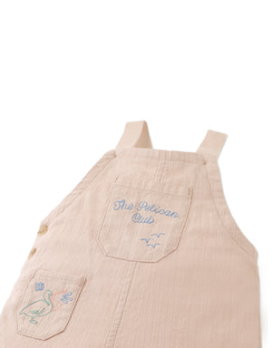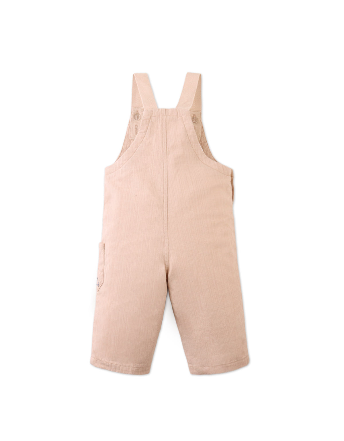 A breezy one-piece for sunny-day fun, this beige woven slub linen-like cotton jumpsuit features embroidered pockets for a cheerful touch. Light and easy to move in, perfect for your little one’s everyday adventures.