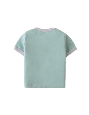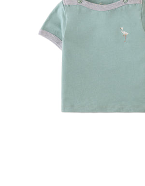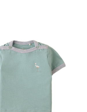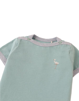 With its refreshing green hue, contrast ribbing, and cheerful flamingo print, this boat neck short-sleeved tee offers a laid-back yet stylish look for your little one.
