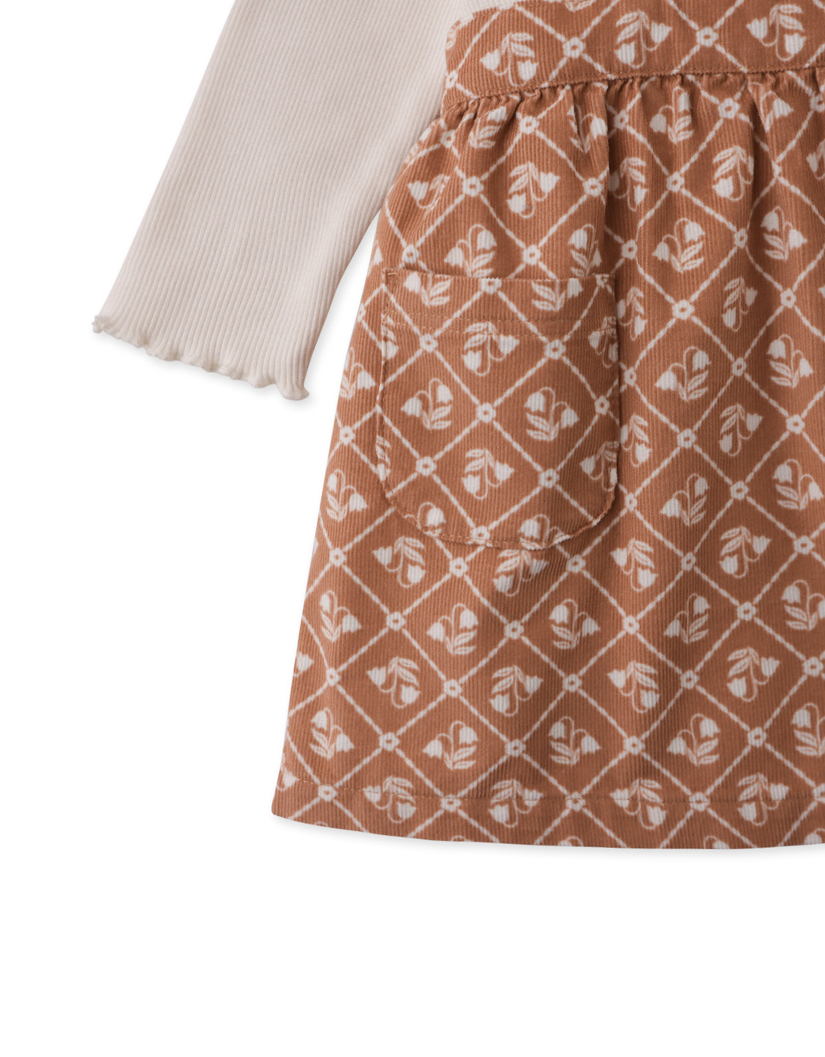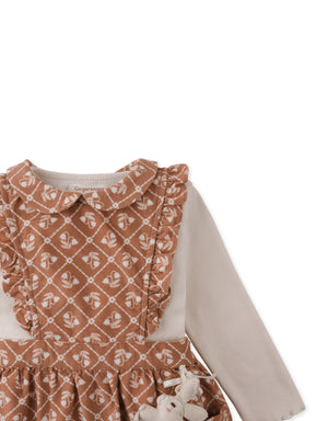 Let the Baby Sabrina Pinafore Dress in Brownfields pattern bring cozy comfort and playful joy, with its ribbed long-sleeve tee and an endearing bunny plushie as the perfect companio