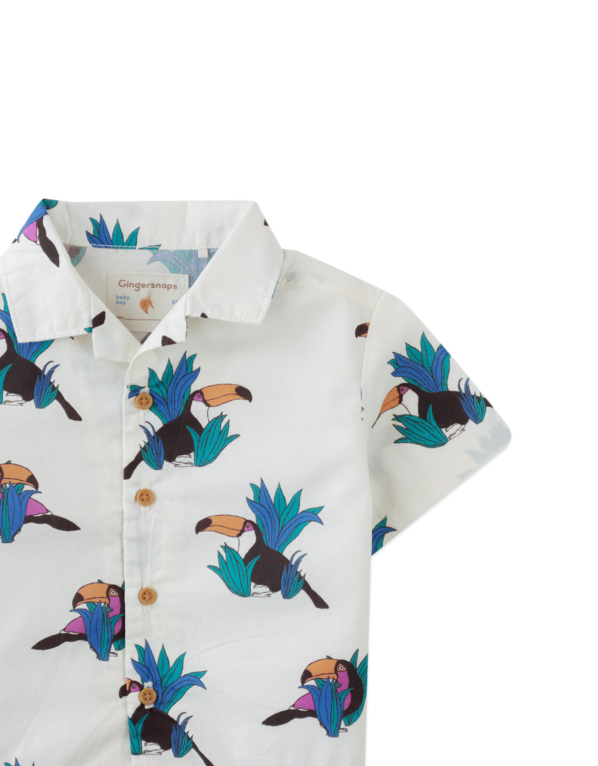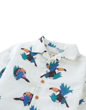 Brimming with tropical charm and lightweight ease, this linen Panama shirt with a toucan print is a vibrant choice for your little buddy.