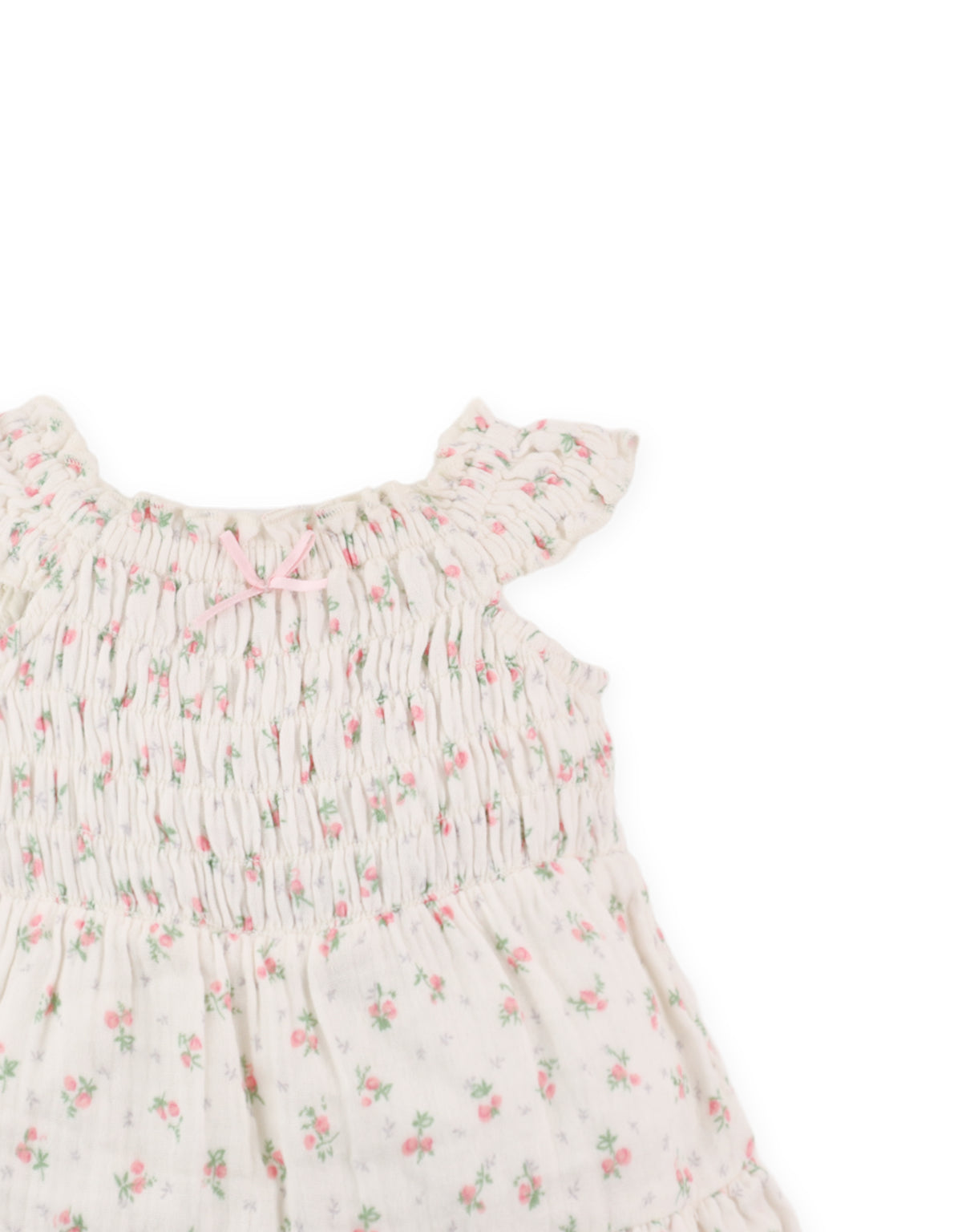 Who says adventure can’t be pretty? This white floral muslin playsuit with smocking, ribbon, and inner shorts proves that playtime and adorableness go hand in hand.
