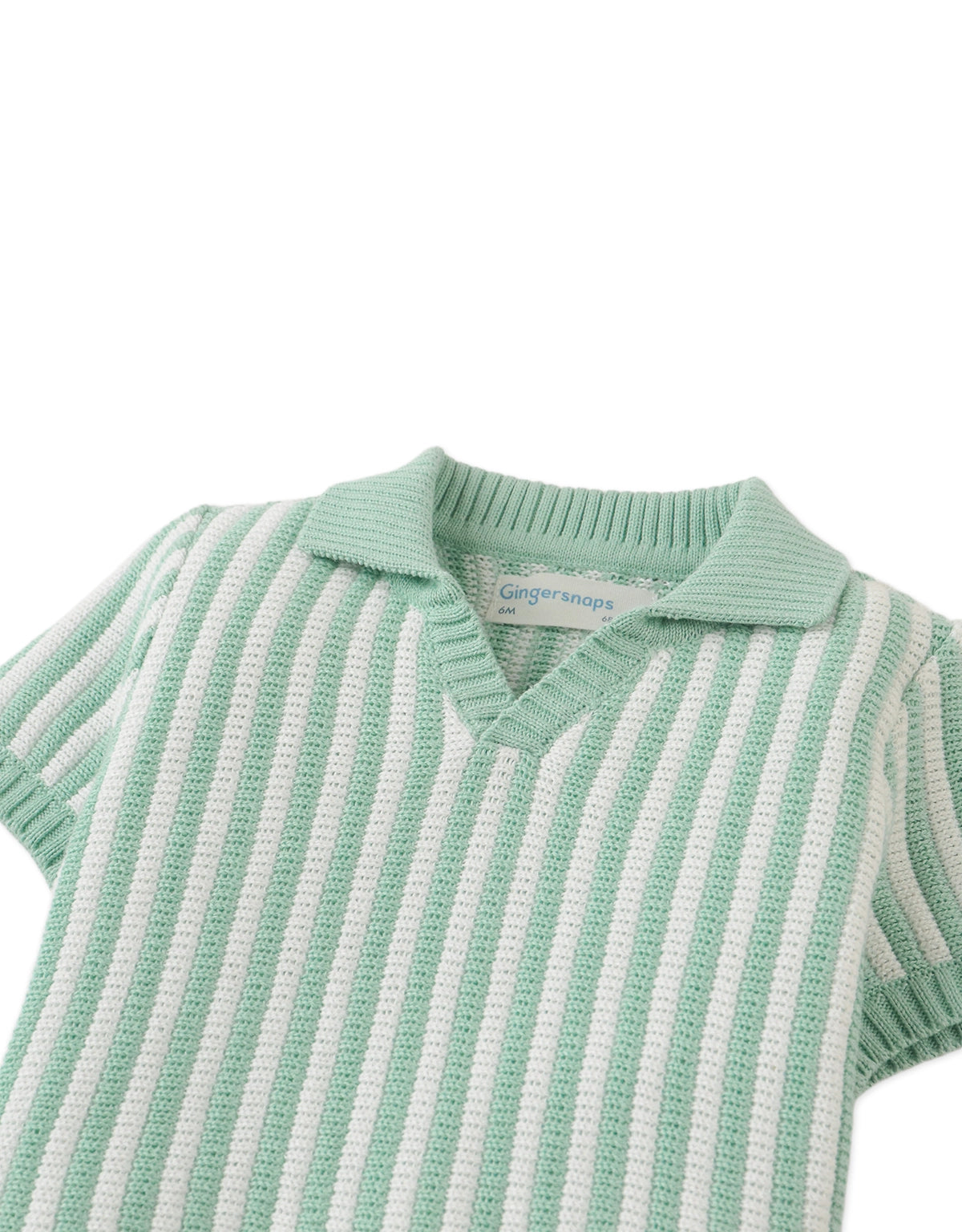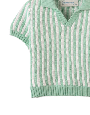 With its soft, breathable texture and crochet-style knit, this short-sleeved polo shirt keeps your little one comfy all day. Green vertical stripes and a retro-inspired look make it a standout piece for easy, polished style.