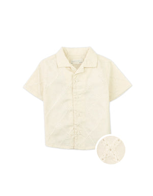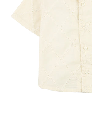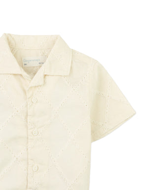 This beige short-sleeved eyelet-embroidered shirt blends texture and detail, creating a refined piece that elevates your little buddy's everyday outfits.