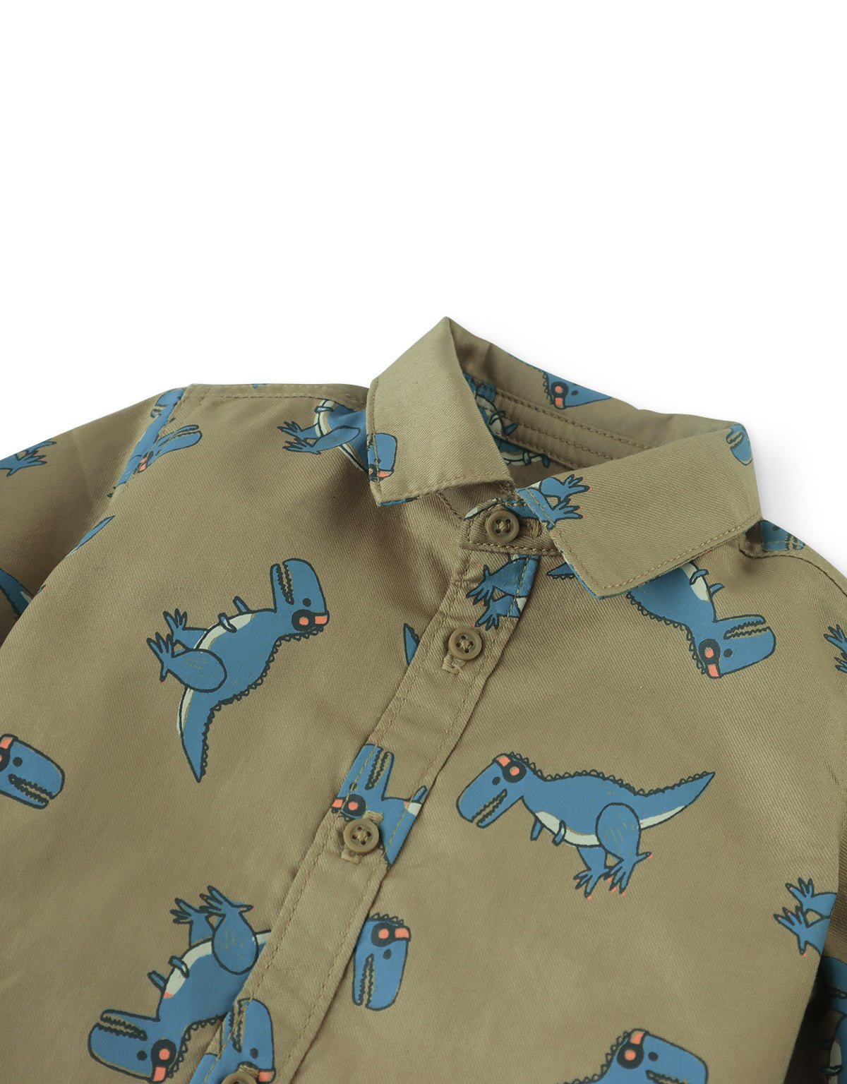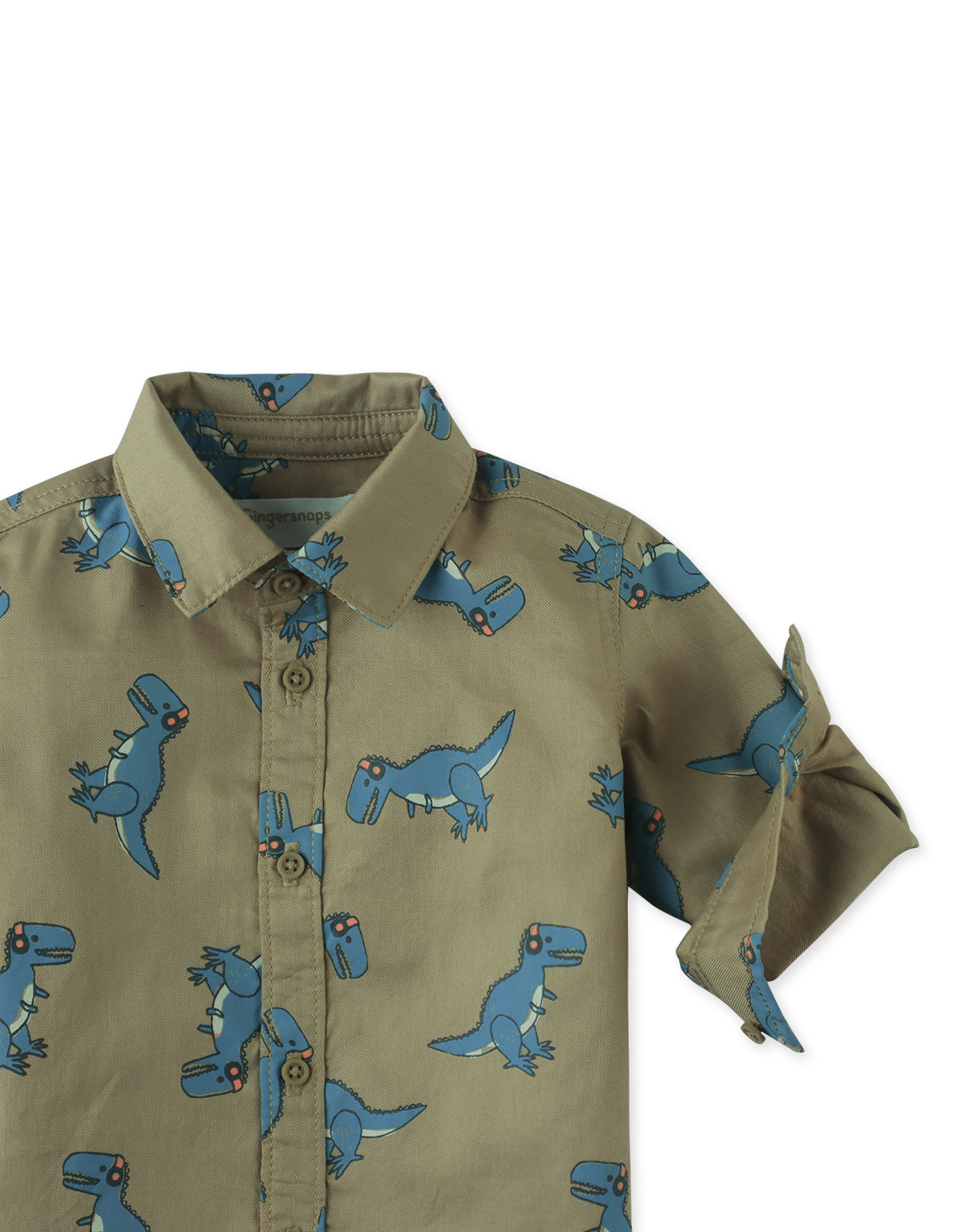 Add a playful pop to his outfit with our Baby Zeph Long Sleeves Shirt in khaki green, featuring our Rex Rave print.