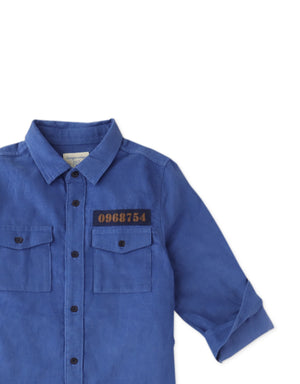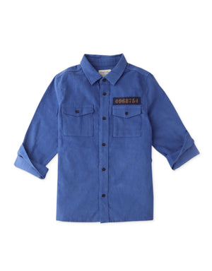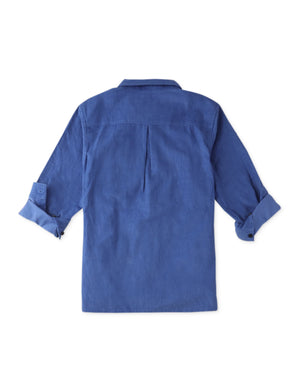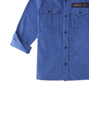 The elegance of our deep blue corduroy pocket shirt is a sophisticated choice that maintains a pristine and striking appearance throughout the day.