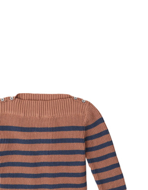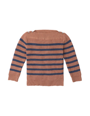 This striped cotton knit pullover with the most delightful boat neckline will keep him cute and cozy all day!