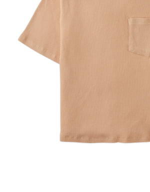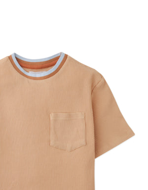 This waffle knit tee keeps your boy comfortable and stylish, featuring a soft textured feel, a duotone neckband, and a choice of khaki or green for a laid-back, everyday look.