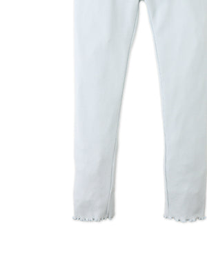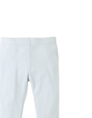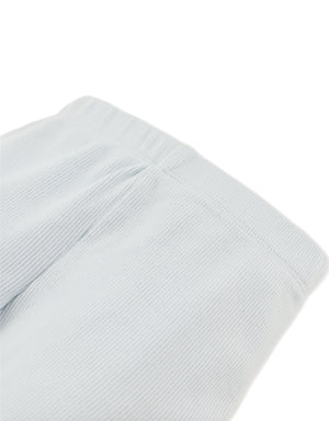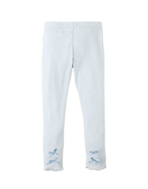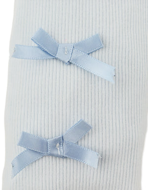 Every step feels a little lovelier in these blue ribbed leggings, where dainty white back bows and a merrow-edged hem bring fun to her everyday activities.