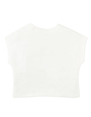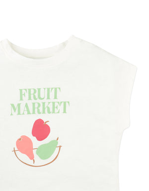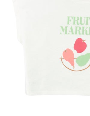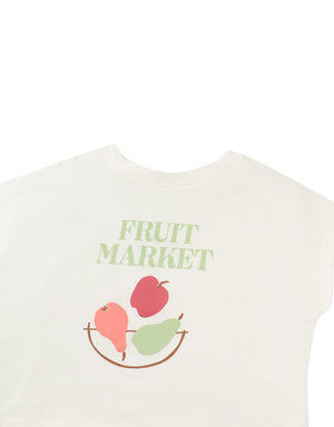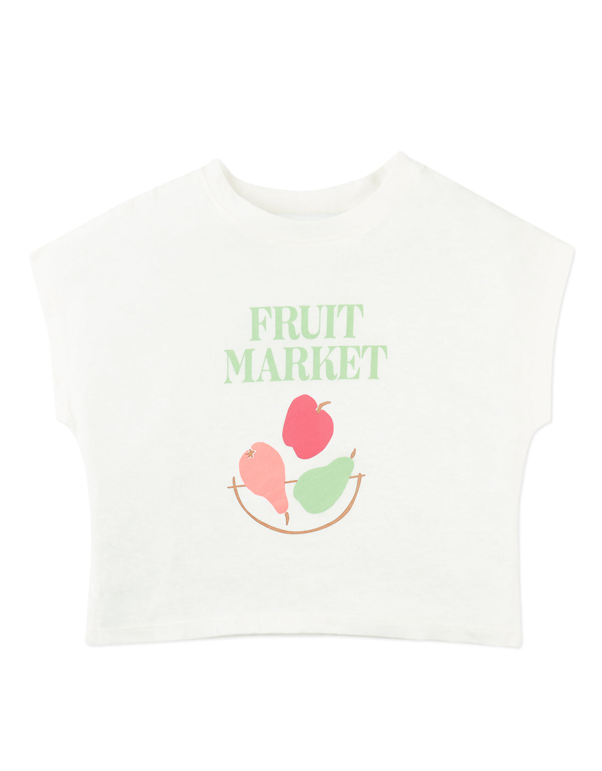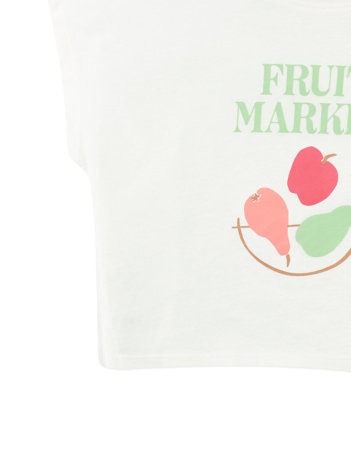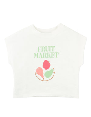 Let your little one breeze through the day in this dolman sleeve t-shirt, featuring relaxed sleeves and your choice of two whimsical prints, a chatty cockatiel or a colorful fruit market.