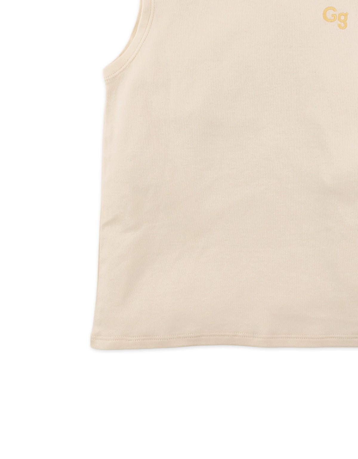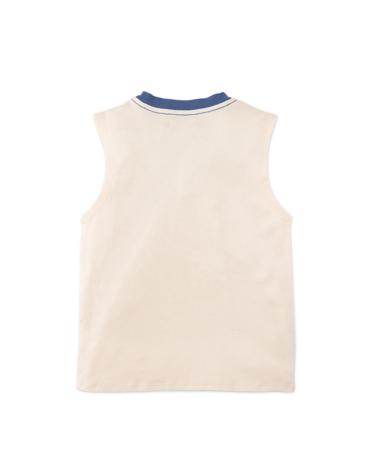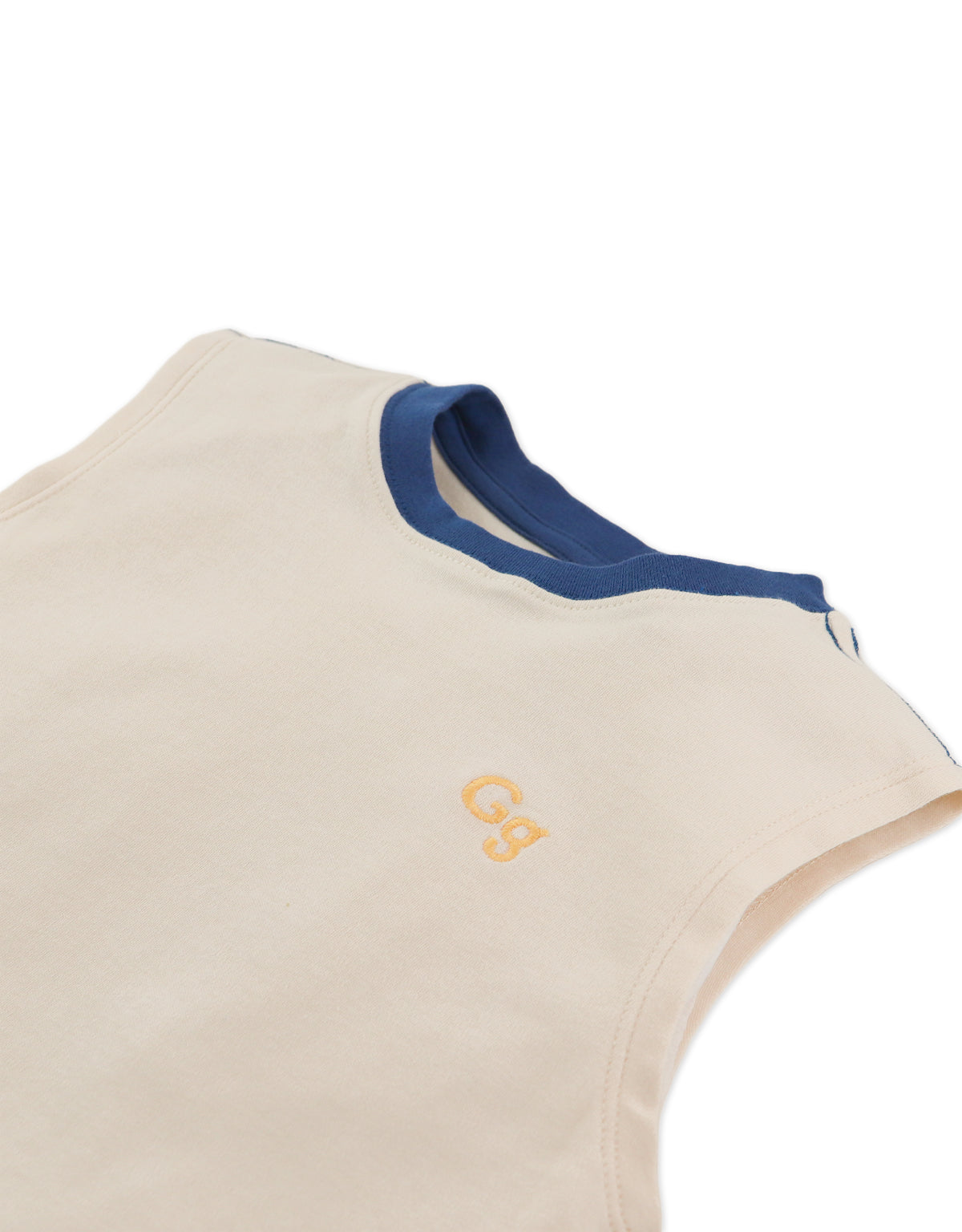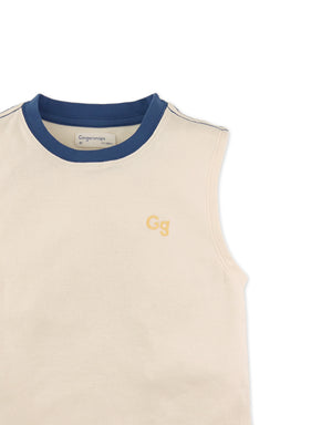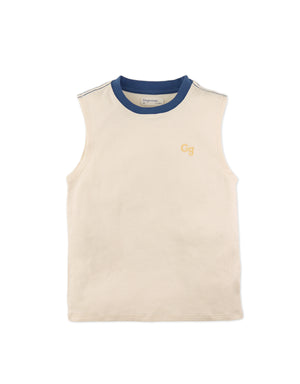 Available in beige or blue, this interlock jersey muscle tee for boys, features a bold contrast neckband and an embroidered logo, combining comfort and style for everyday wear.