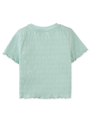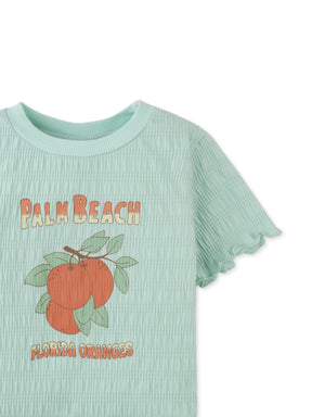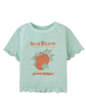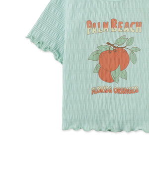 Bringing a cheerful vibe to your little darling's day, this green smocked baby tee with a Palm Beach Orange graphic is a vibrant addition to your little one's wardrobe.