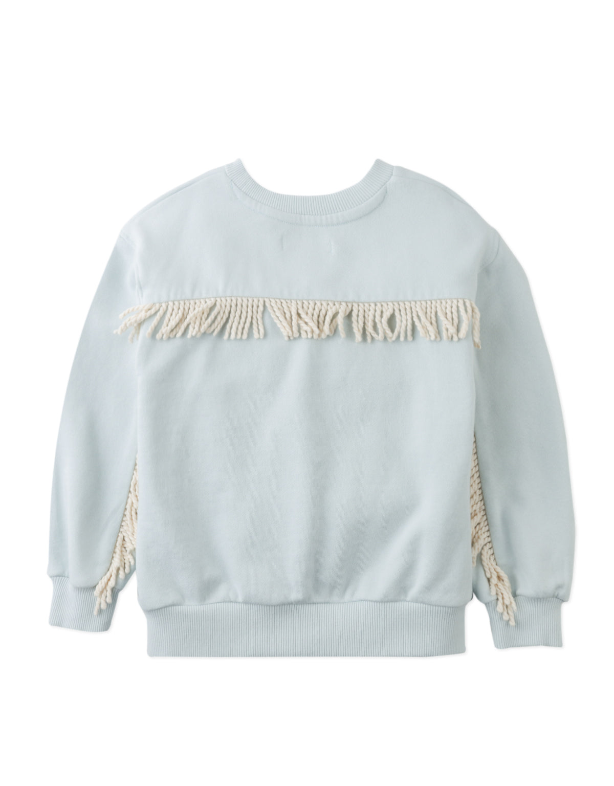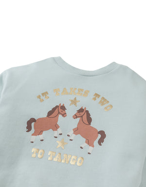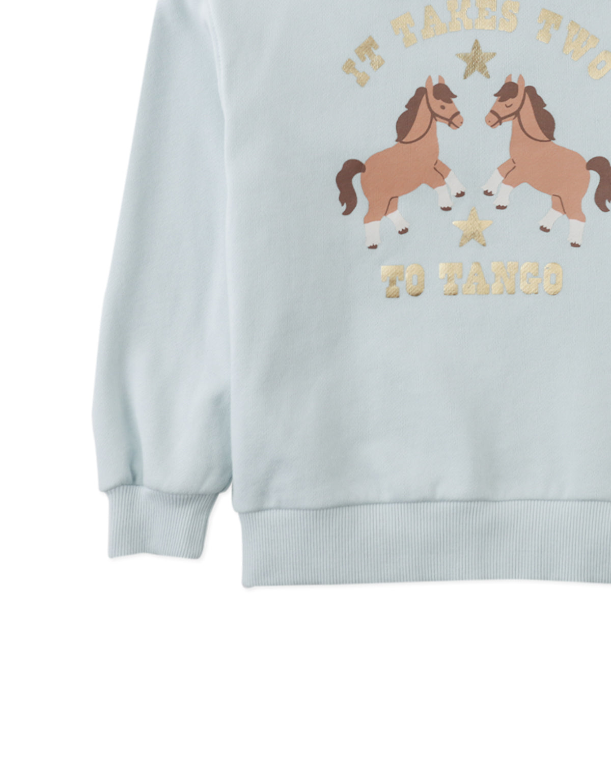 The Cheyenne Pullover in blue, featuring whimsical dancing horses and fringes reminiscent of western cowgirls, adds an energetic vibe to your little one’s wardrobe