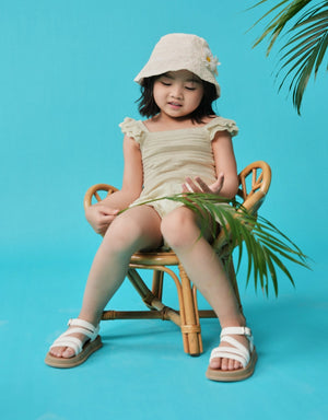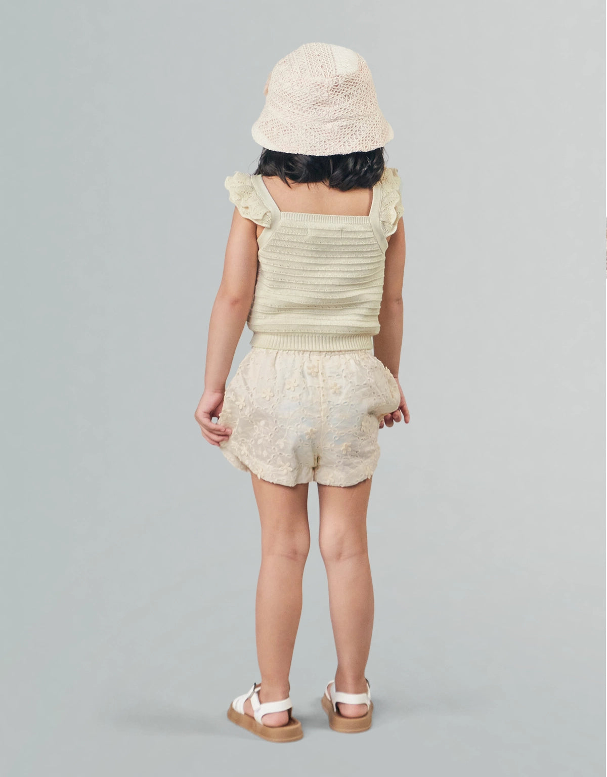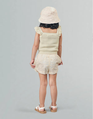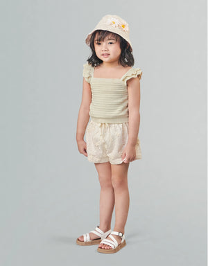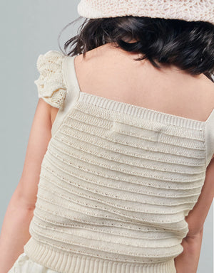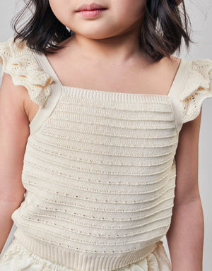 Ideal for both casual and dressed-up occasions, this beige textured knitted shell top with scalloped ruffle pointelle sleeves offers a perfect mix of elegance and fun for your little one.