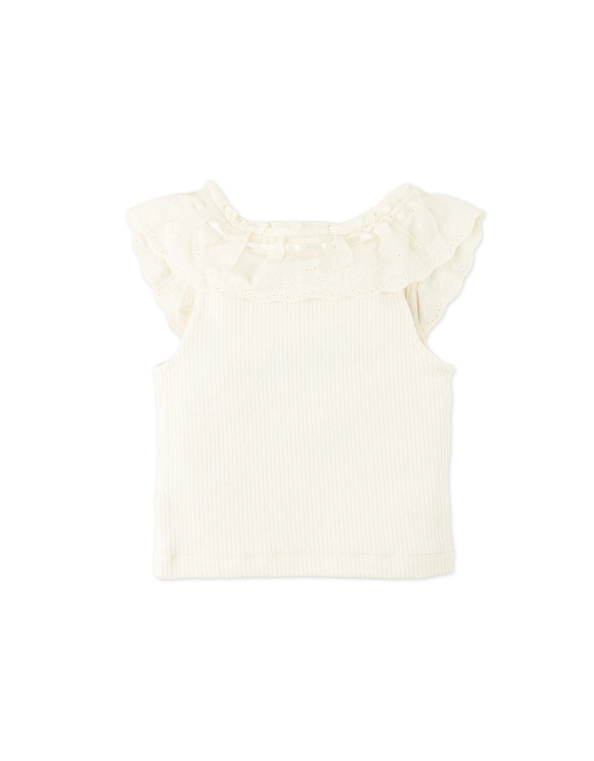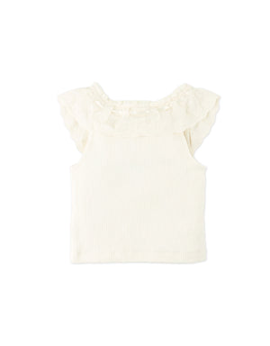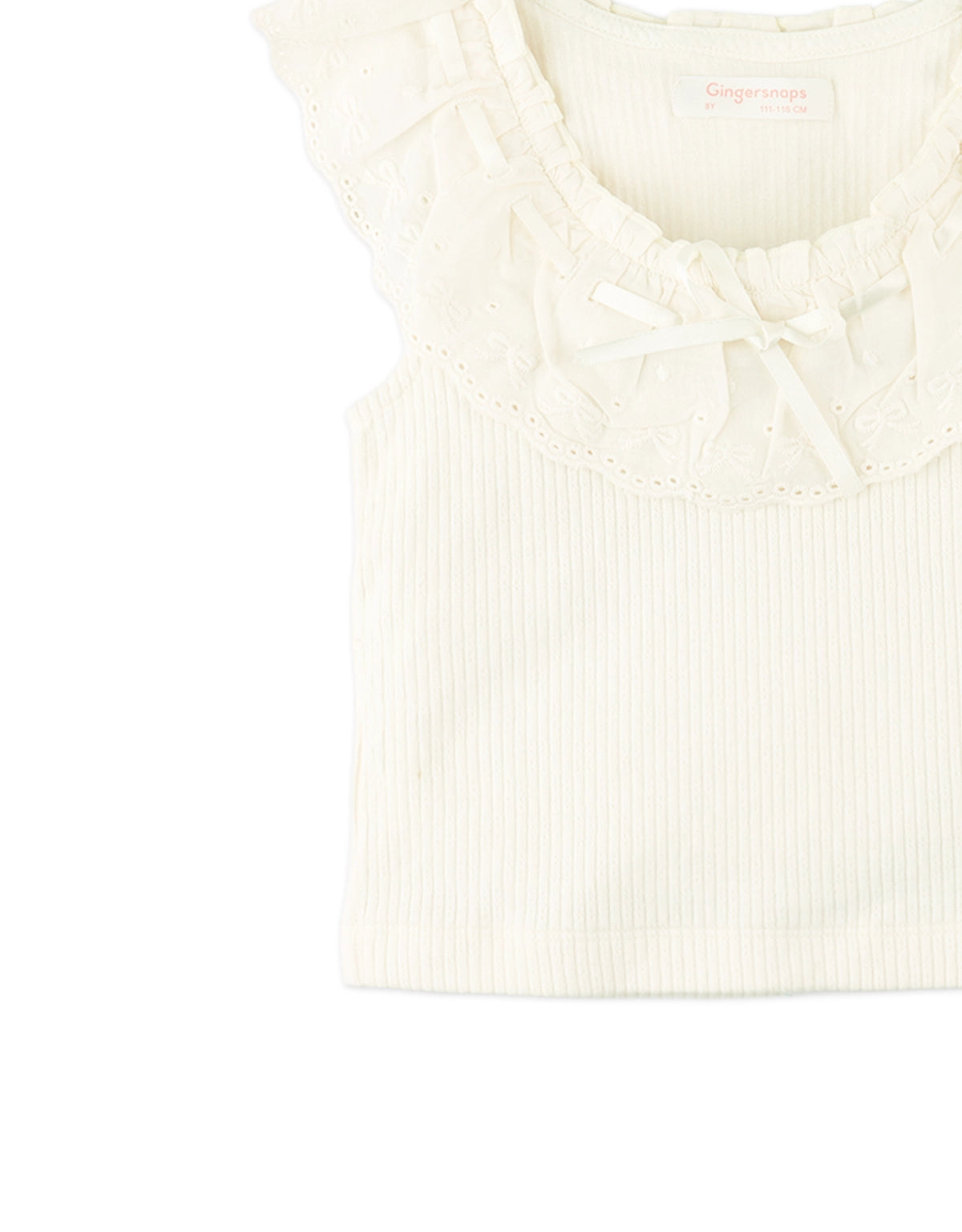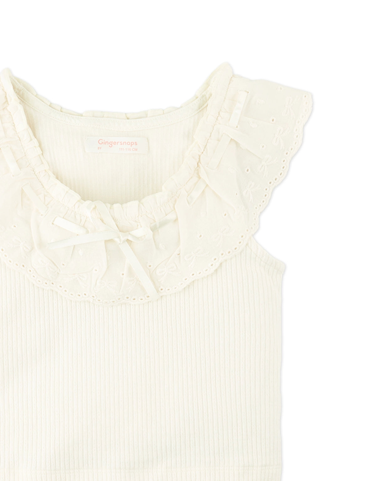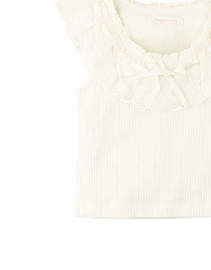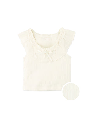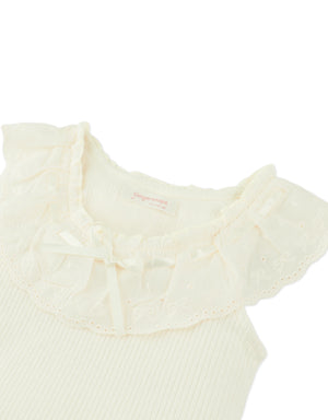 This off-white ribbed top features dainty scallop trims and a cheerful bow, offering a light, refined fit ideal for everyday twirls and little explorations.