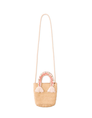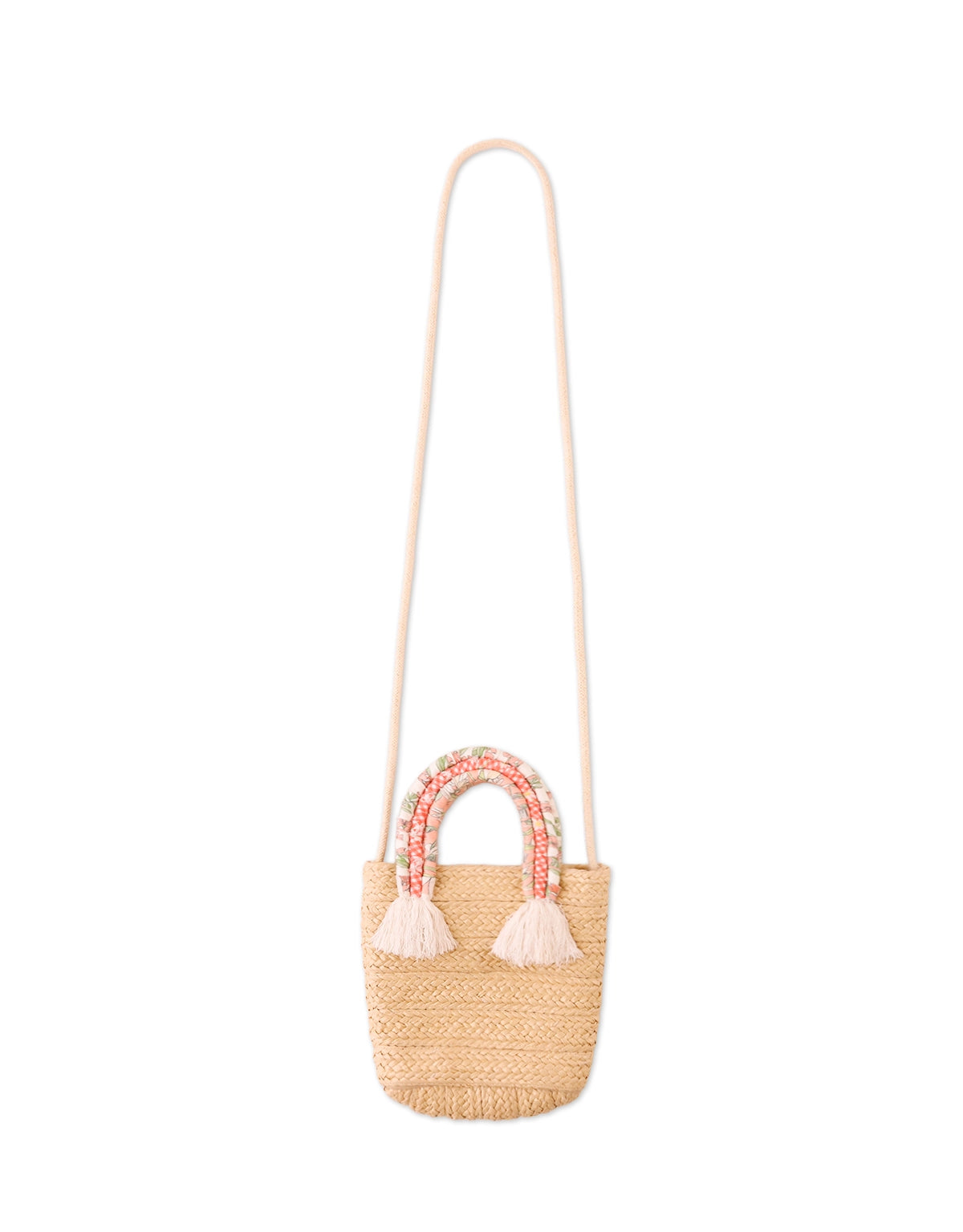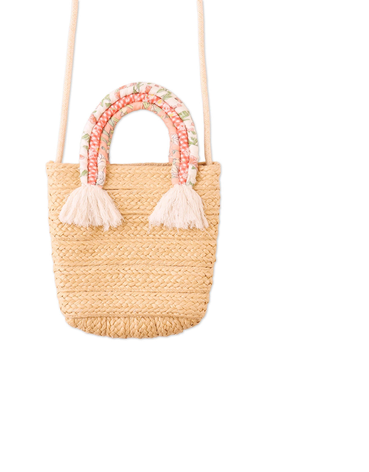 A charming everyday accessory, this beige raffia sling bag features a playful printed fabric handle, perfectly sized for little explorers who love to carry their tiny treasures in style.