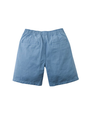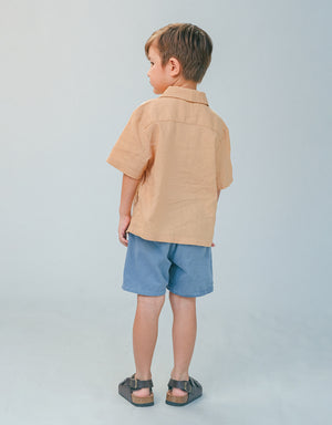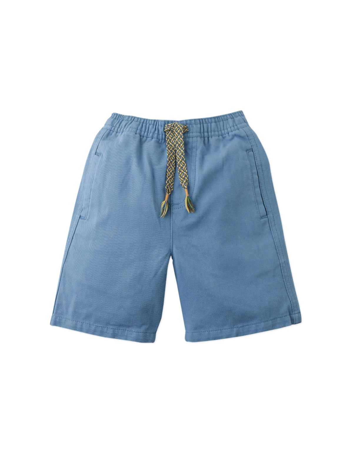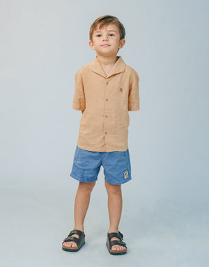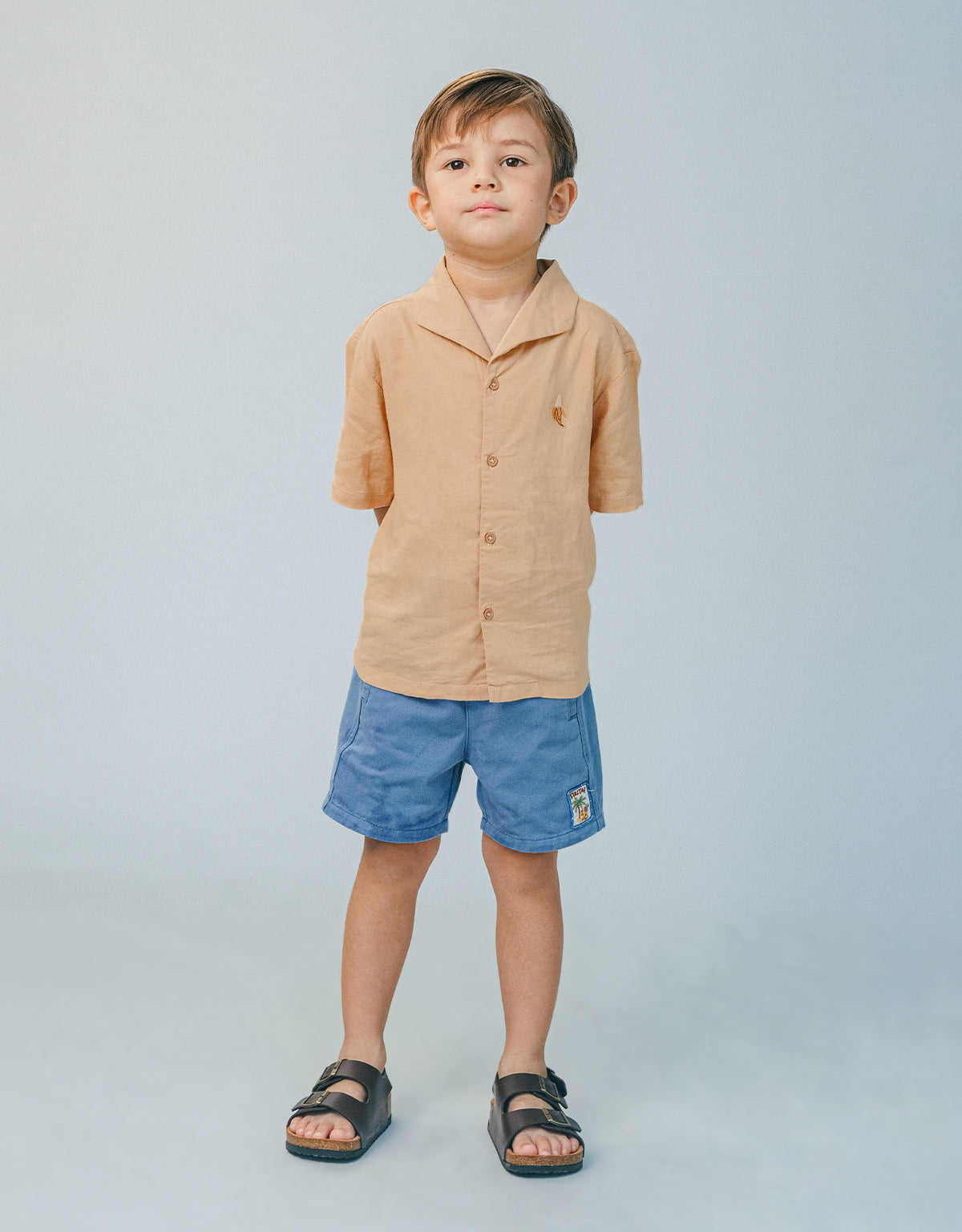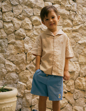 These classic Bermuda shorts feature an embroidered patch detail, offering a refined yet playful touch in versatile blue or beige for your little explorer.