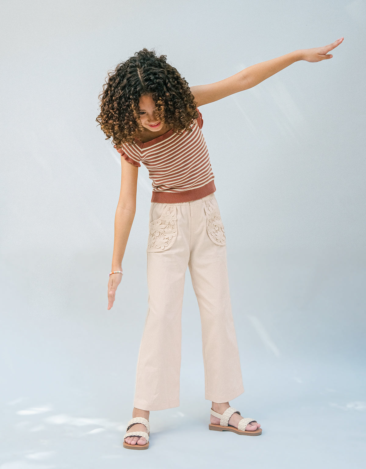 Outfit your little one in breezy wide-leg pants with a delicate floral-appliquéd pocket, perfect for both play and special moments.