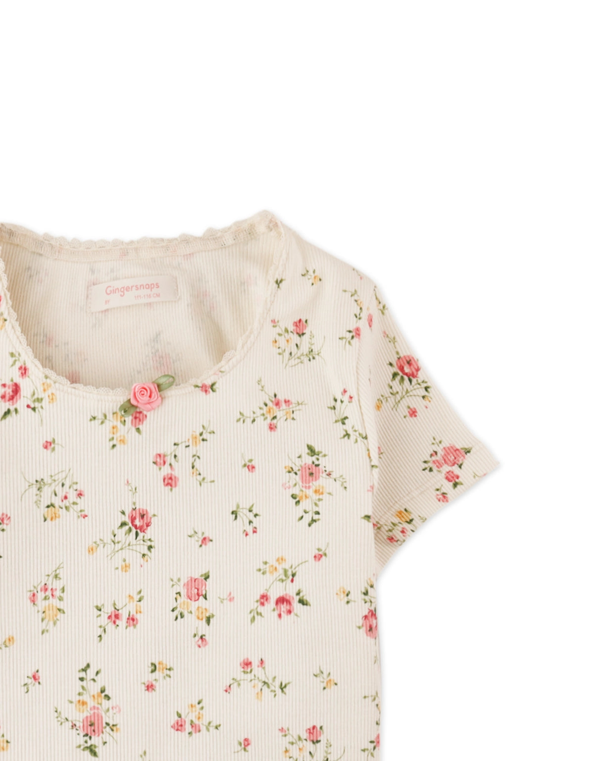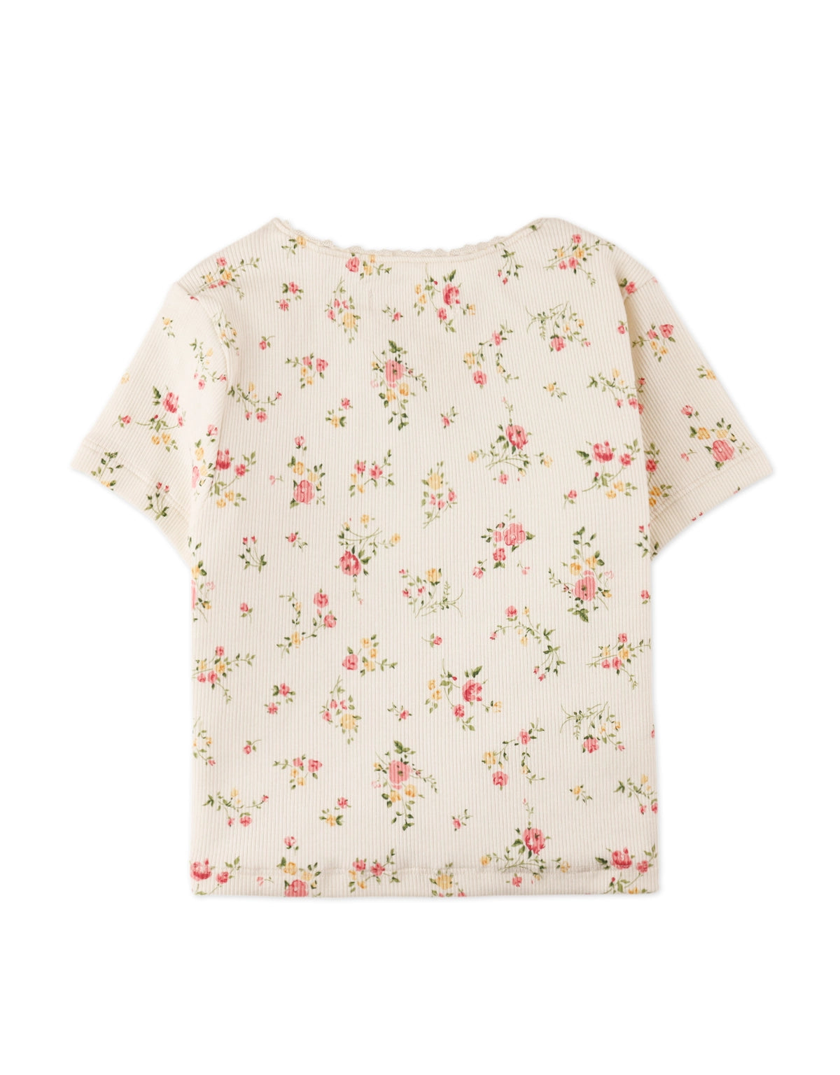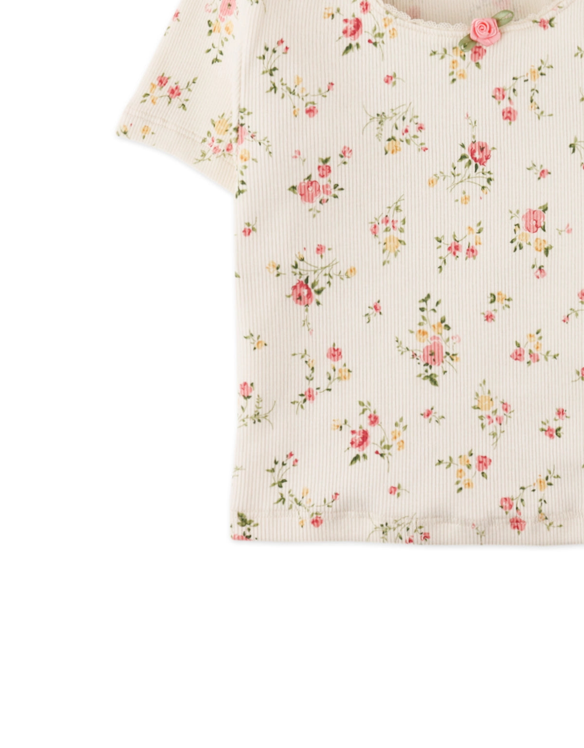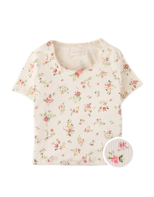 Available in white or pink, this floral crop top is like a soft summer poem: lace tracing its edges, a little rosette blooming at the center, and ditsy florals scattered like petals. A piece that brings loveliness to every outfit.