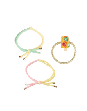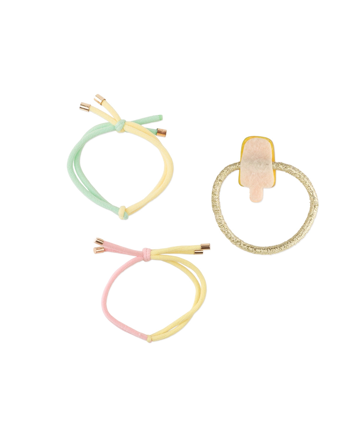 A fun functional trio, this hair tie set in soft pink, light green, and a playful popsicle-accented tie, perfect for mixing, matching, and styling with ease.