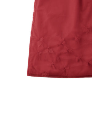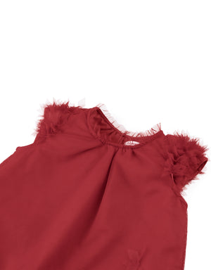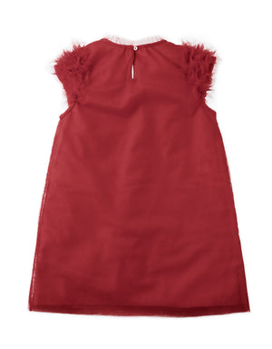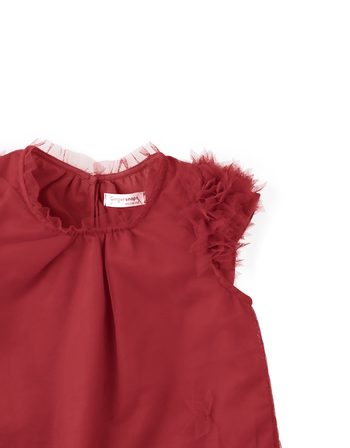 Floral appliques bloom softly across this graceful red swing dress, your little one's perfect style companion for special occasions.